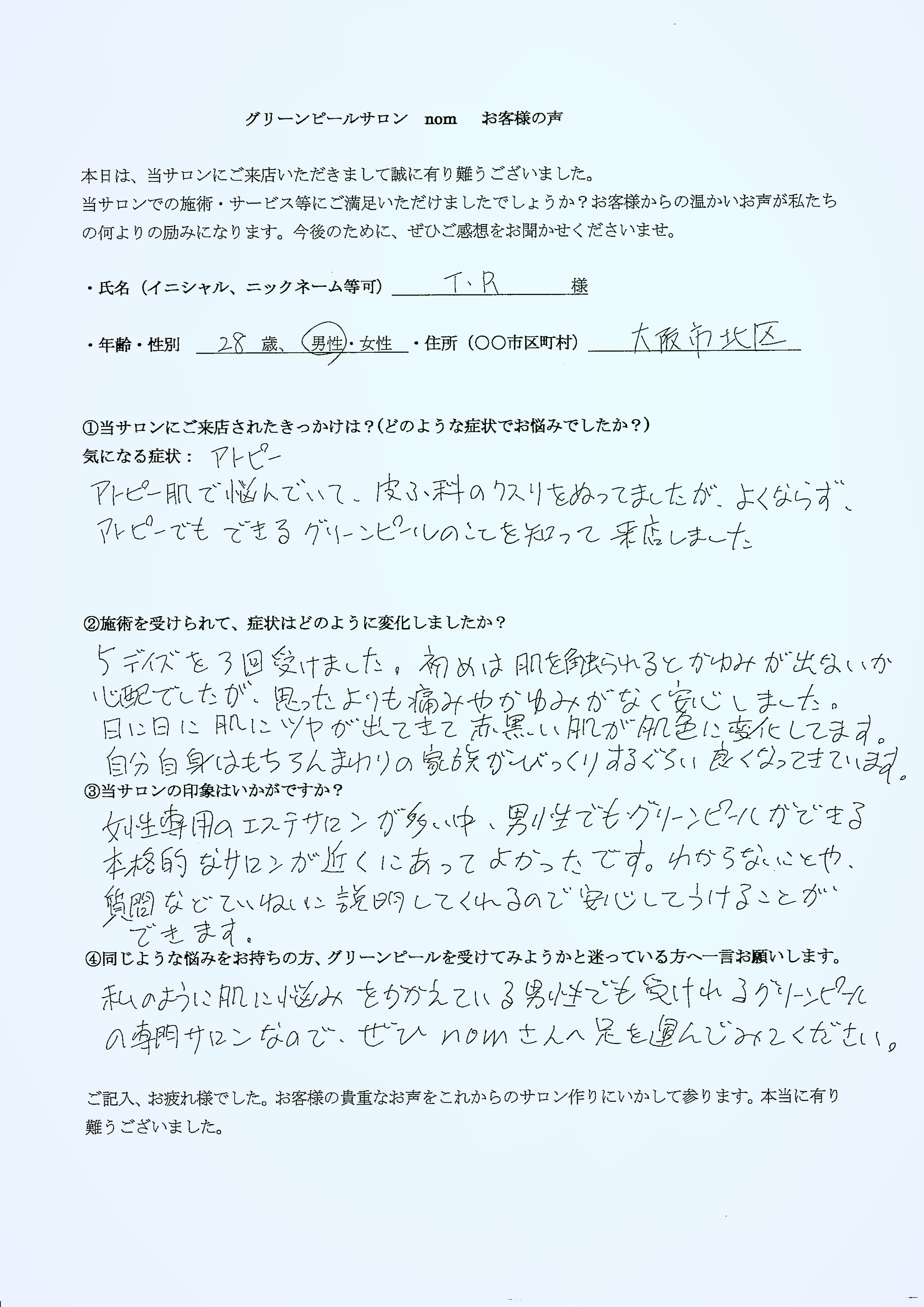 グリーンピールを体験したアトピー性皮膚炎の方からは、「象肌、くすみ肌、黄色っぽい肌、乾燥肌、アトピー肌がみるみる生まれ変わった」という喜びの声も聞かれます。また、ステロイド剤の長期使用による肌トラブルに悩んでいた方が、グリーンピールによって肌質が改善した事例もあります。