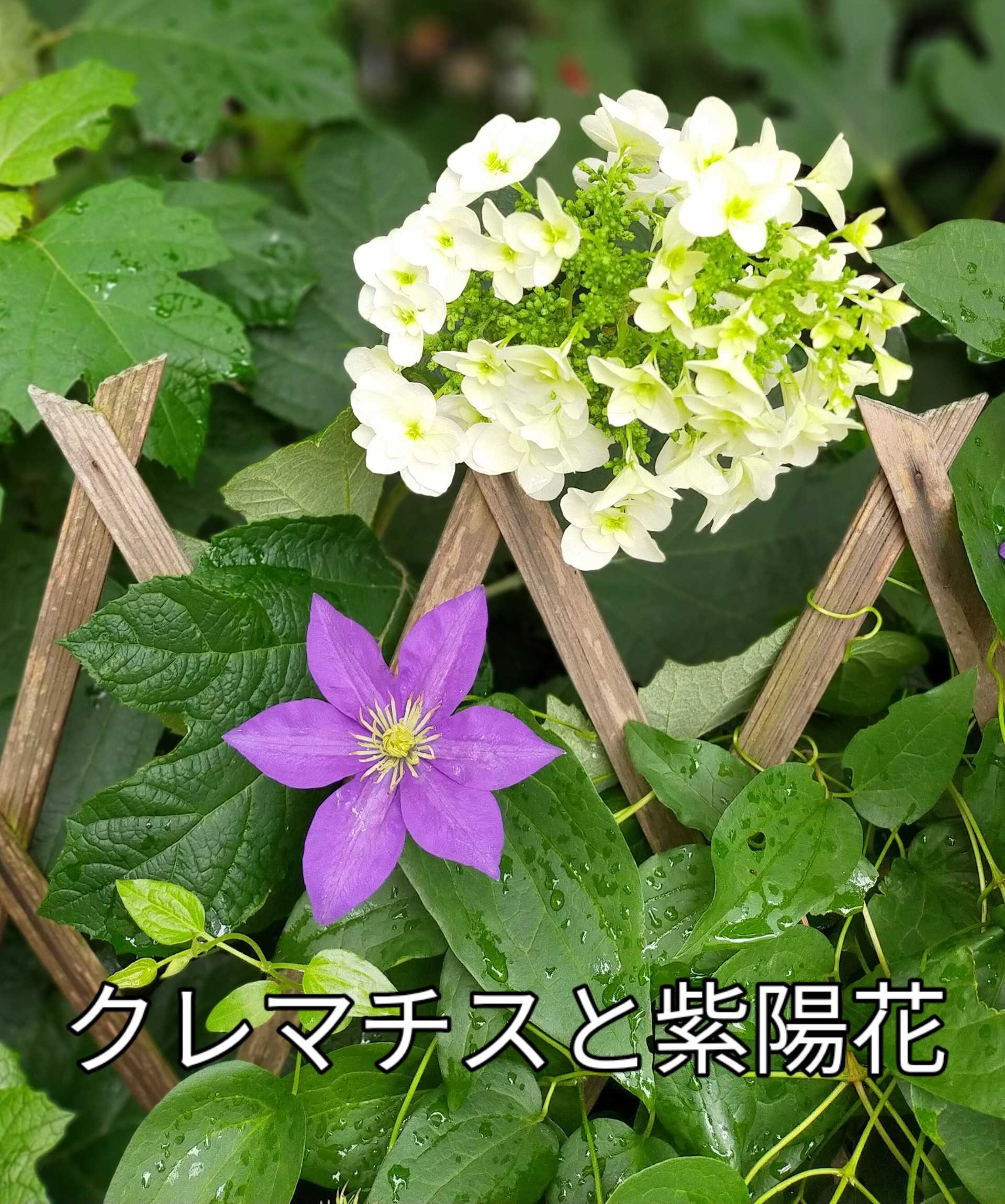 雨に濡れたクレマチスと紫陽花をコラボ撮影