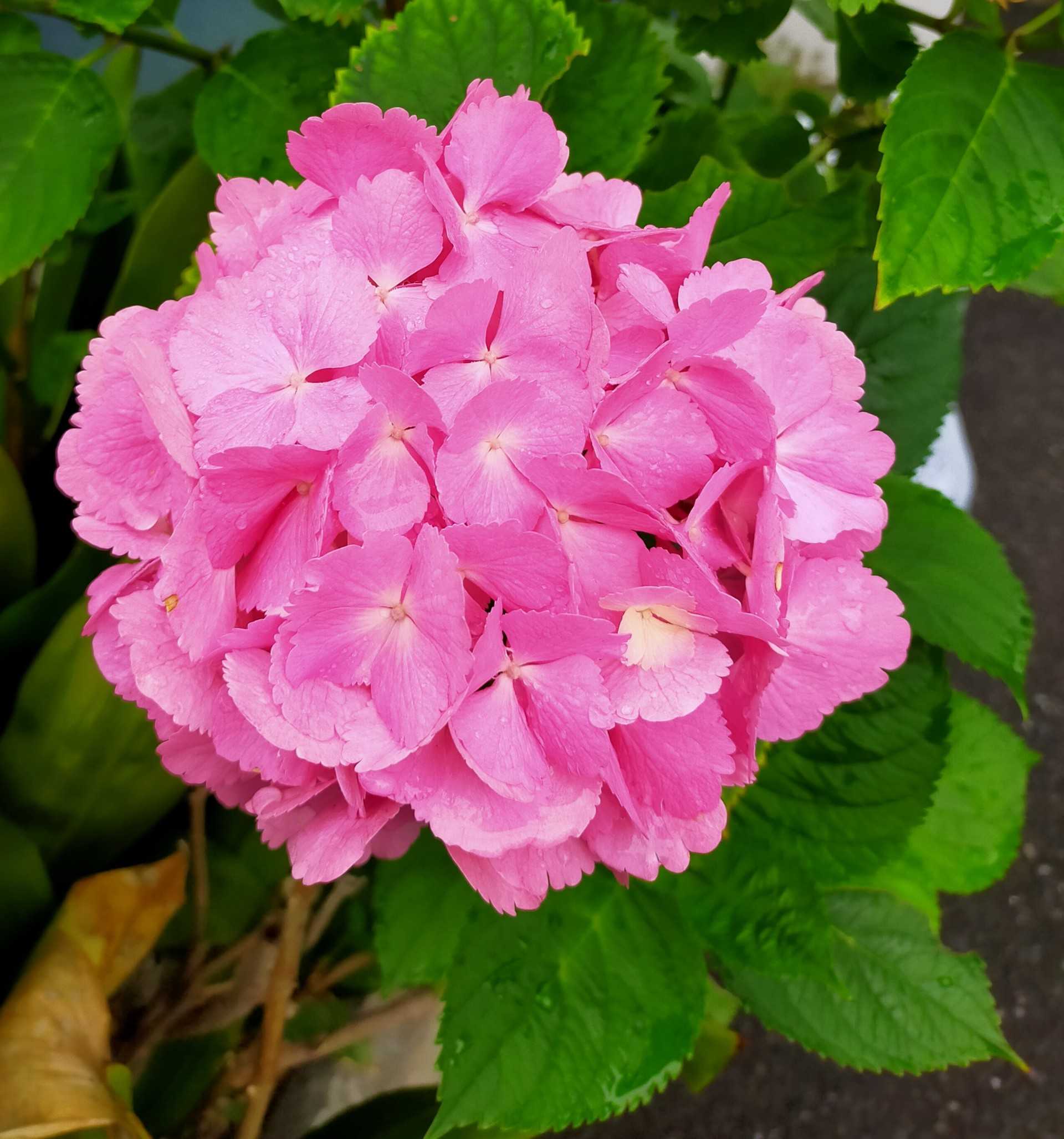 路地に咲いたピンク色の紫陽花が鮮やかでキレイ