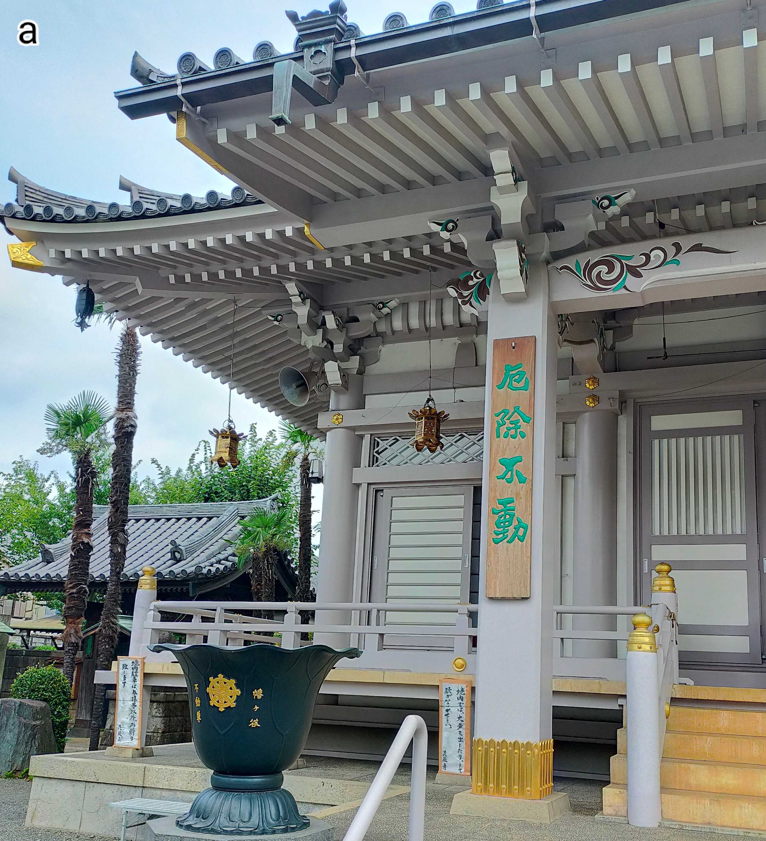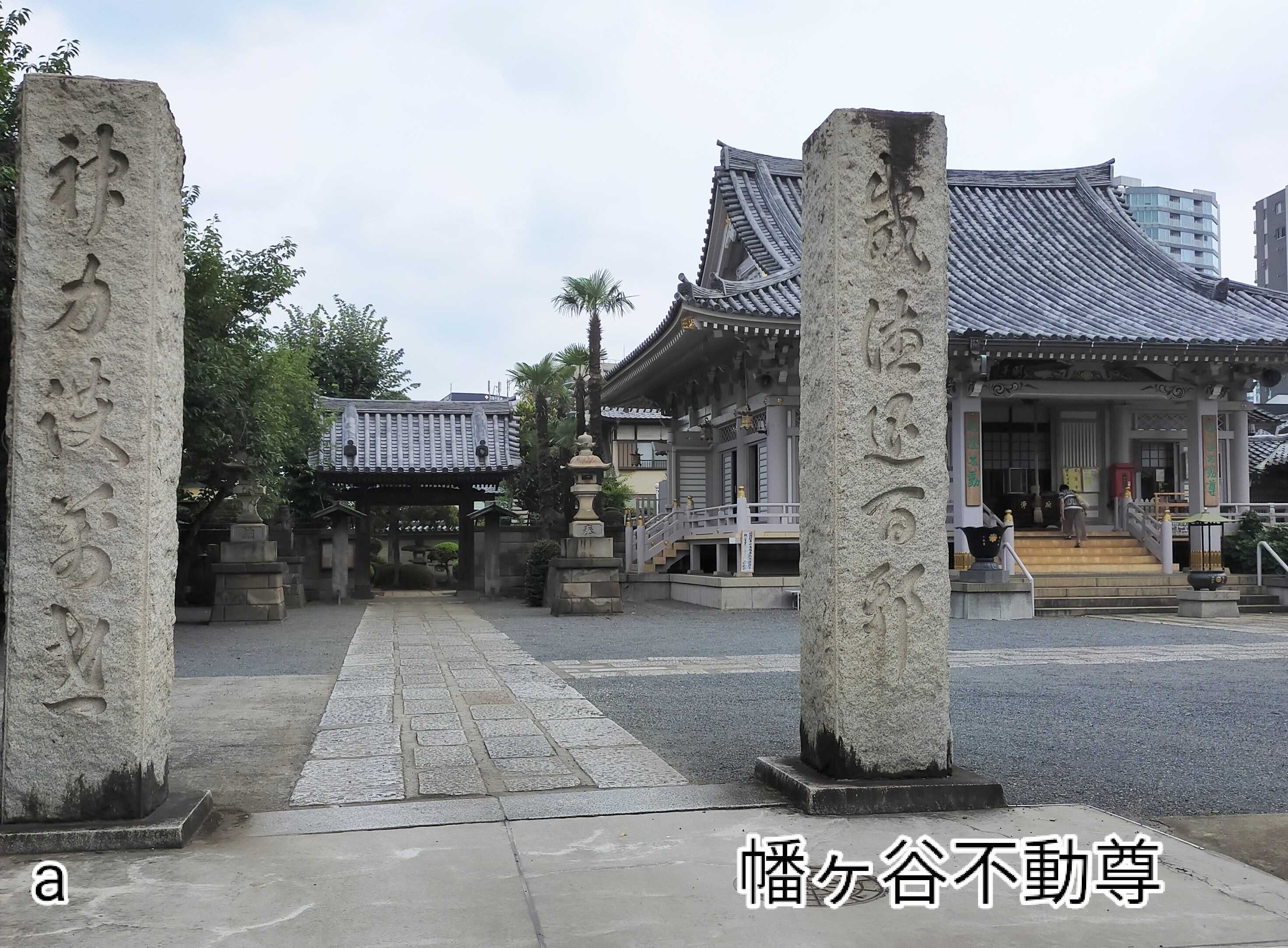 渋谷区不動通り商店街にある幡ヶ谷不動尊の背景は高層ビルです