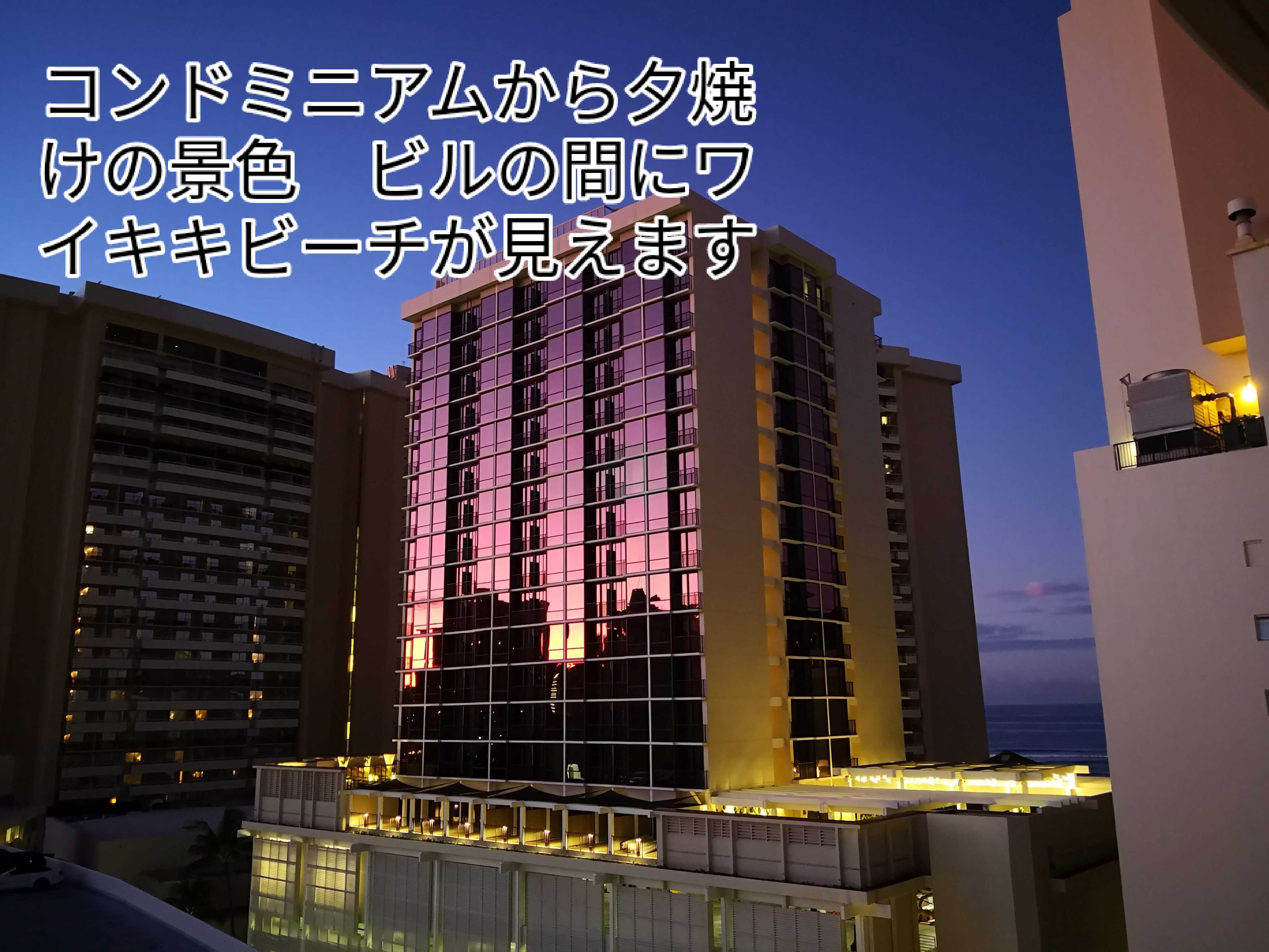 ホテルからの夕焼け風景 ビルの間にwaikikiBeachが見えました