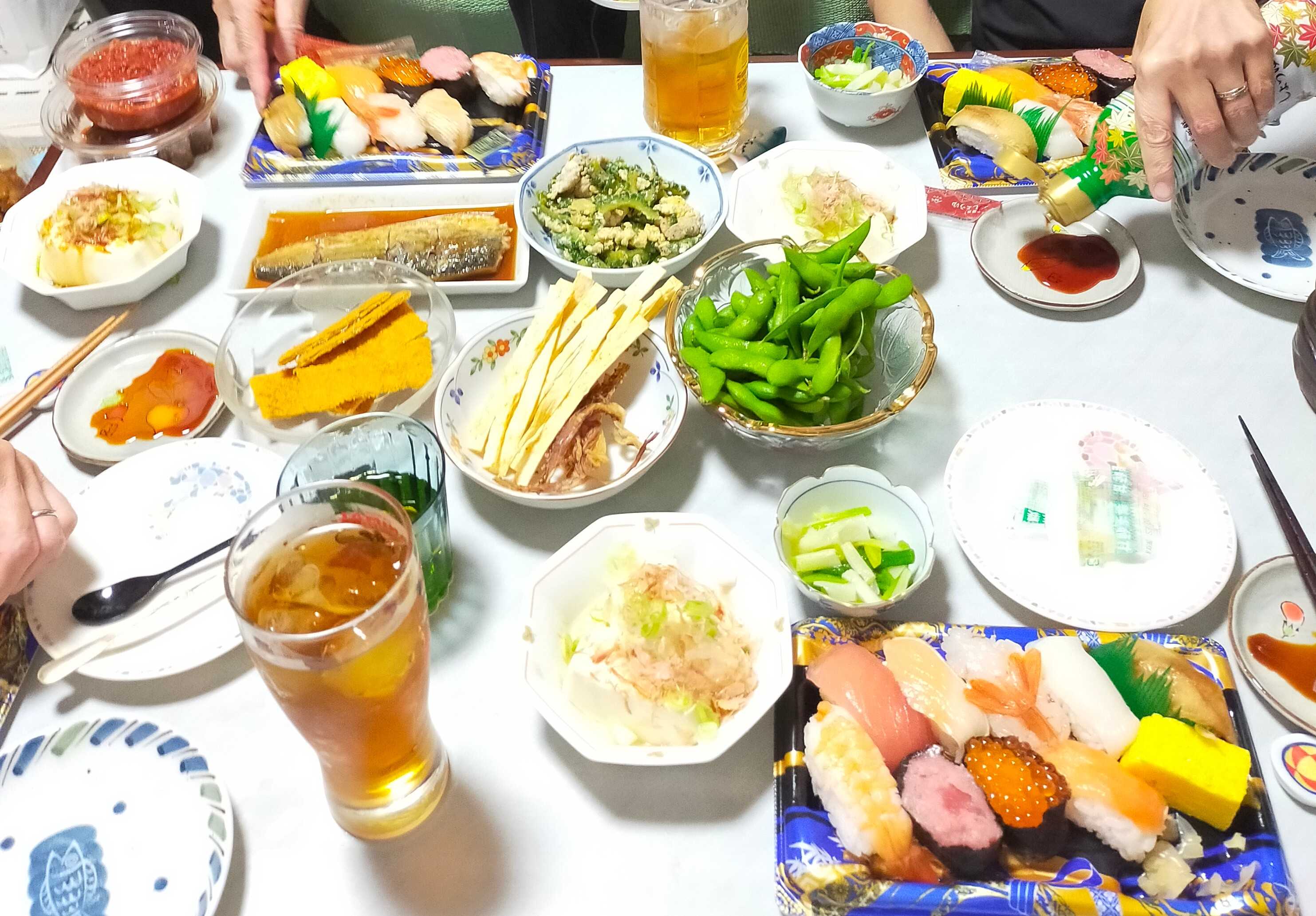 自宅でお寿司🍣 ゴーヤチャンプル 煮鯖 ねぎぬた 枝豆
