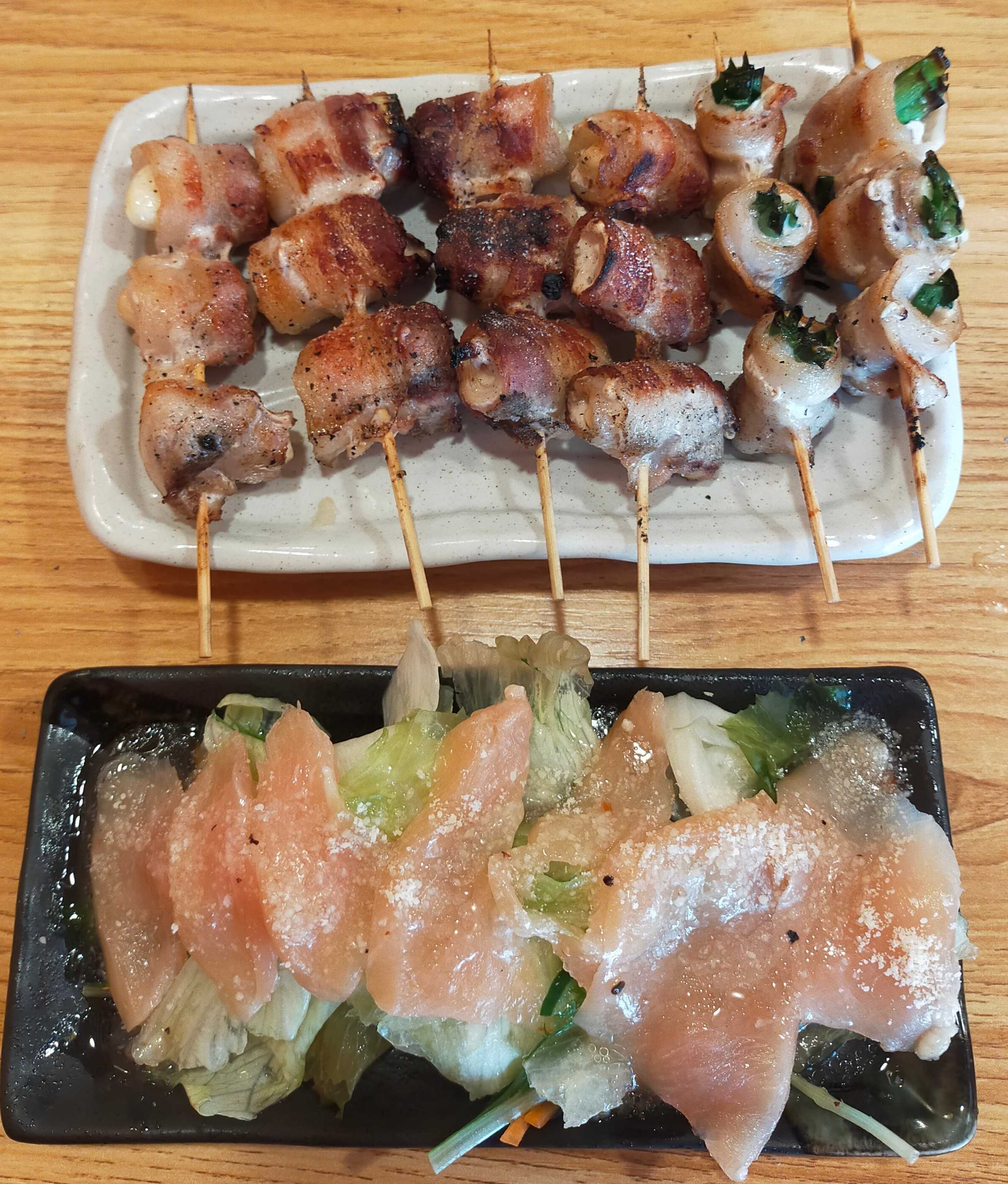 アスパラと大蒜の串焼きと鶏ハムサラダを肴にビールを