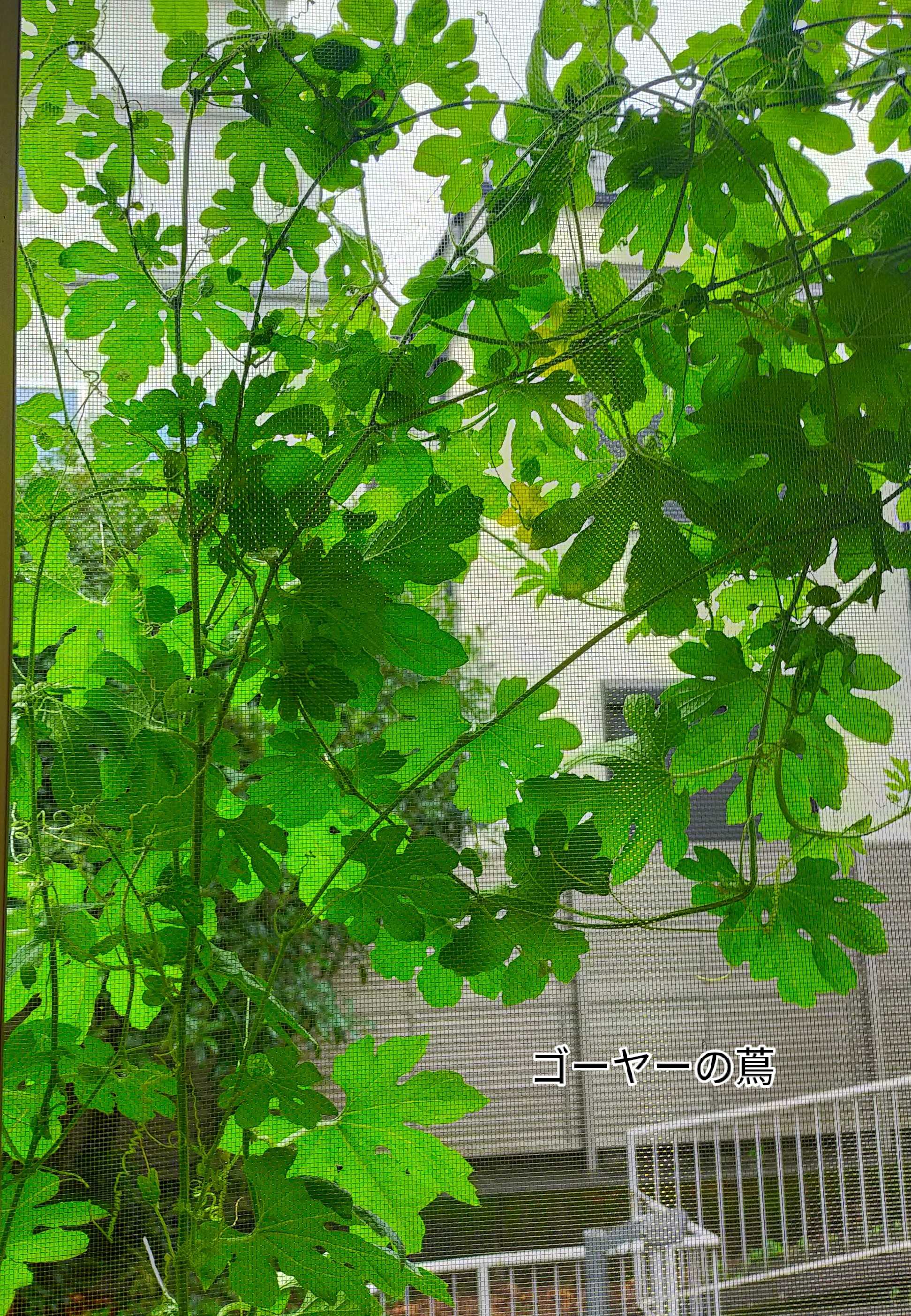 2階カラオケクラブの部屋の窓にゴーヤーといんげんの蔦が