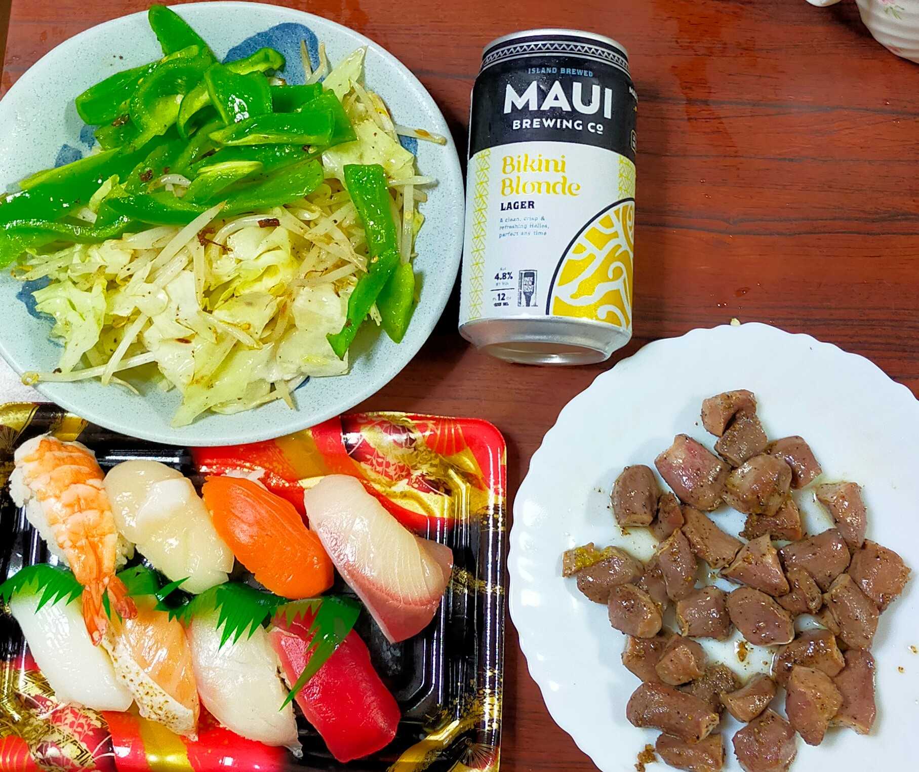 ハワイではお刺身が食べられなかったので帰国翌日に早速お寿司🍣食べました 砂肝焼きの肴にハワイのMAUI☆BEERを