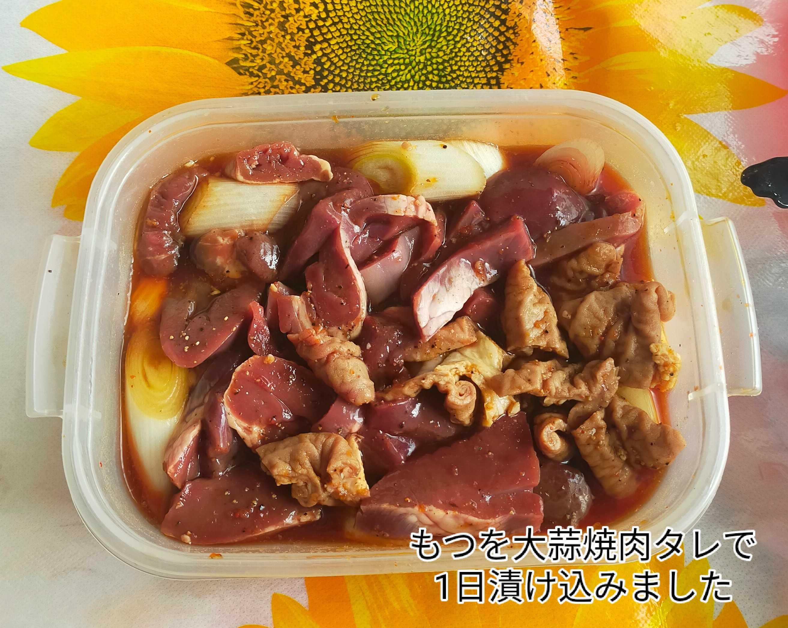男料理(夕食)前日からもつを大蒜焼肉タレで漬け込みました タン ハツ レバー シロ 長ネギ を入れました