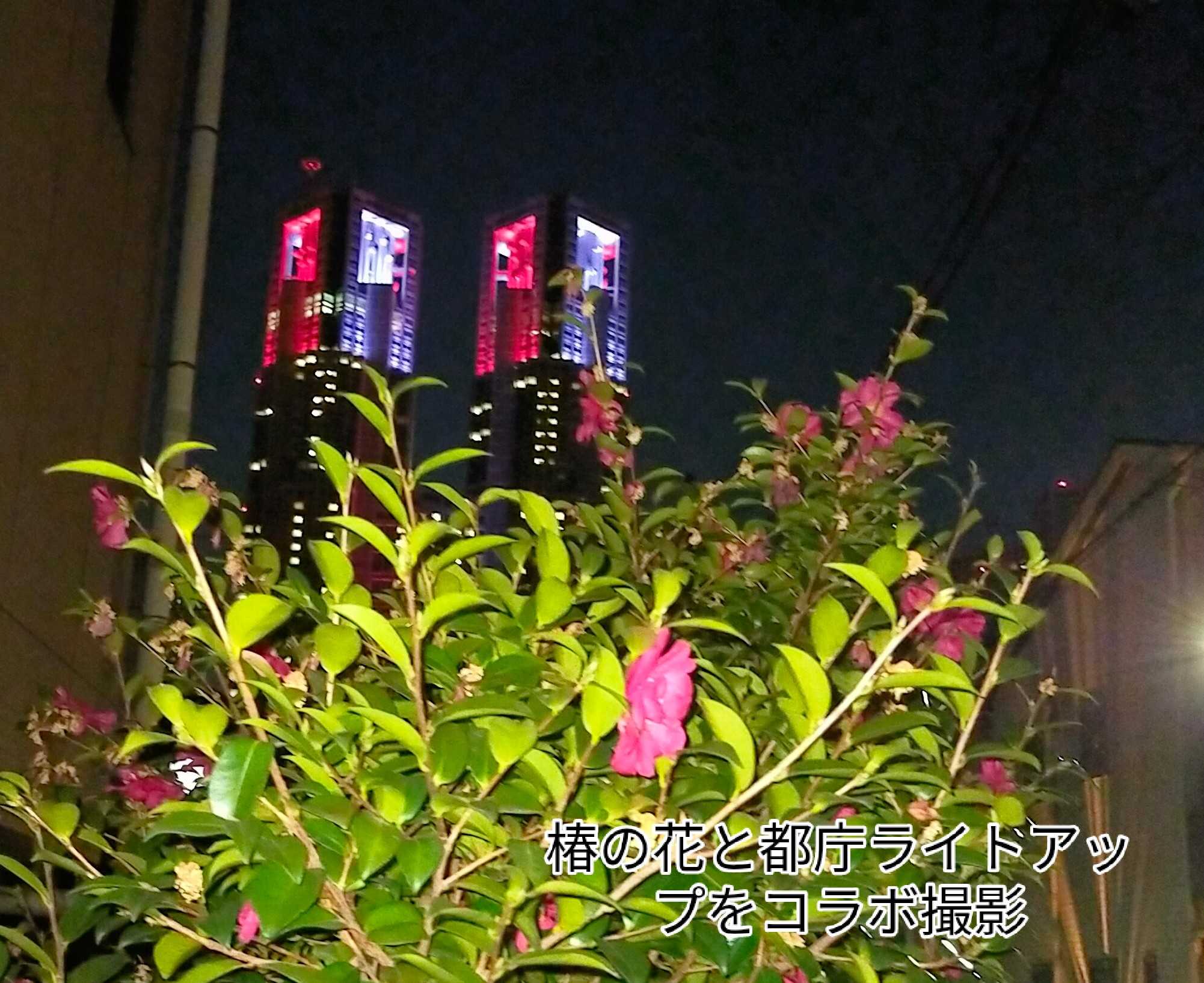 椿の花と都庁ライトアップをコラボ撮影しました スマホのミニフラッシュを使用して撮影しました