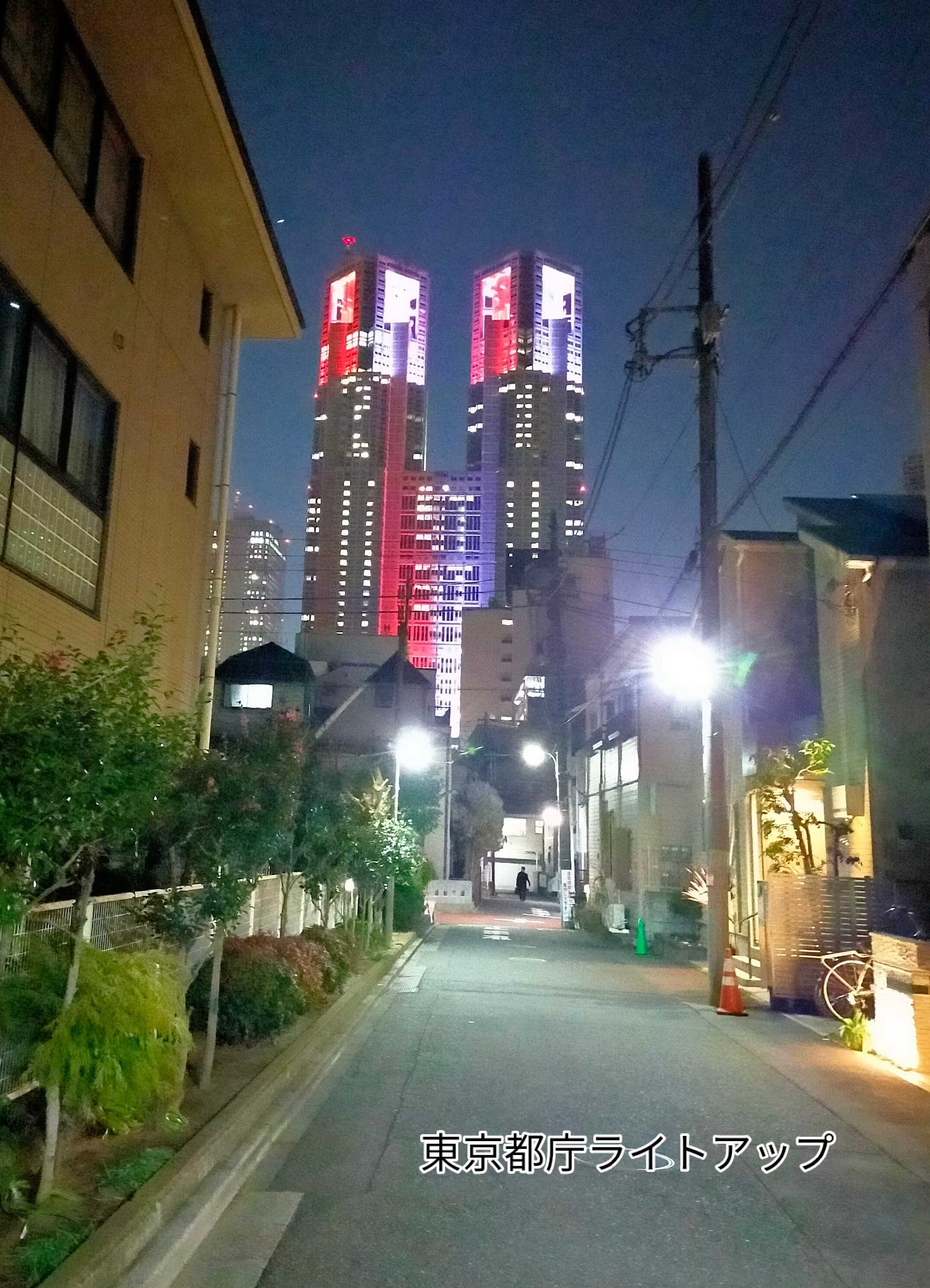 赤色とブルー色のライトアップは珍しいです コロナ感染者が先週同日の曜日より増加は赤色 減少はブルー色です