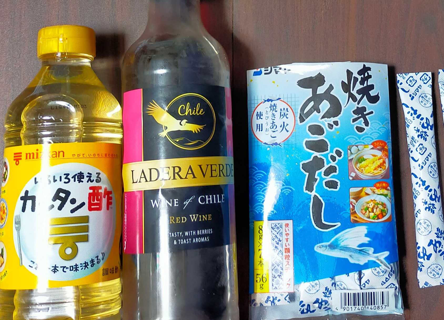 簡単酢1本 赤ワイン1本 焼きあごだし1スティック準備します