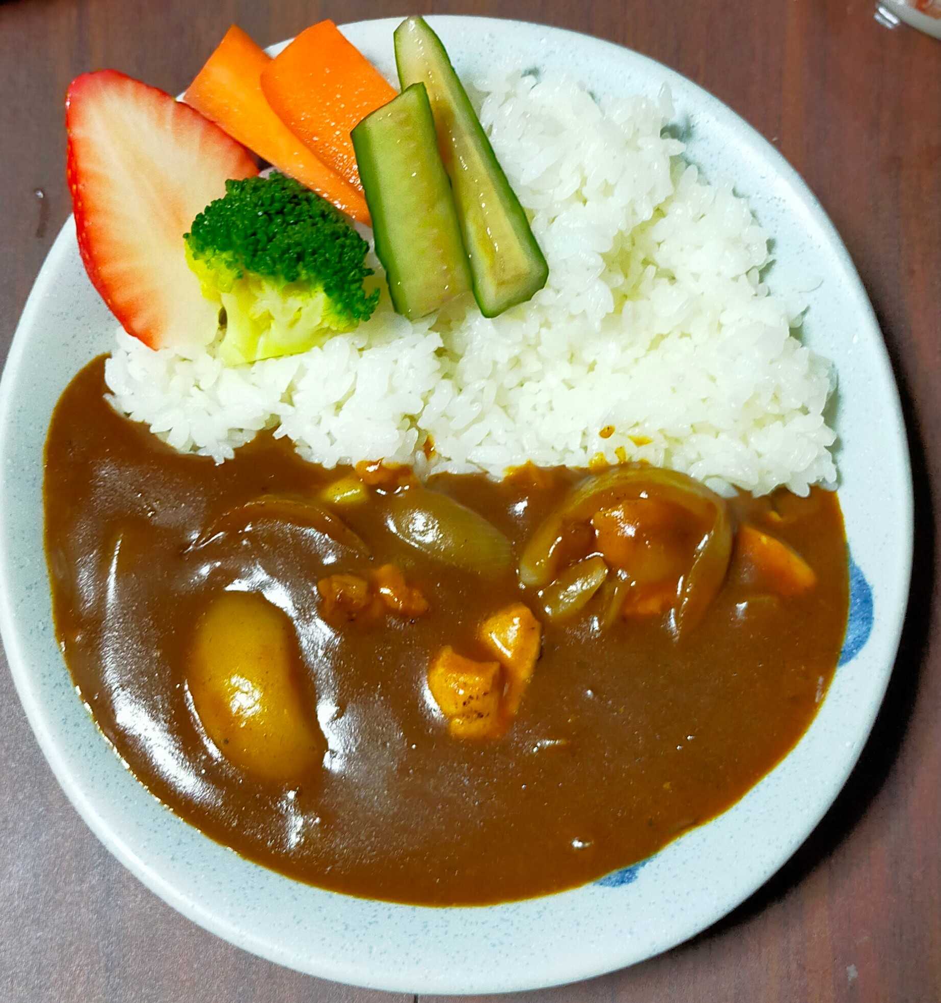 男料理(夕食)ホテル・シェフ欧風ビーフカレー ピクルスとイチゴ🍓とブロッコリーを添えました
