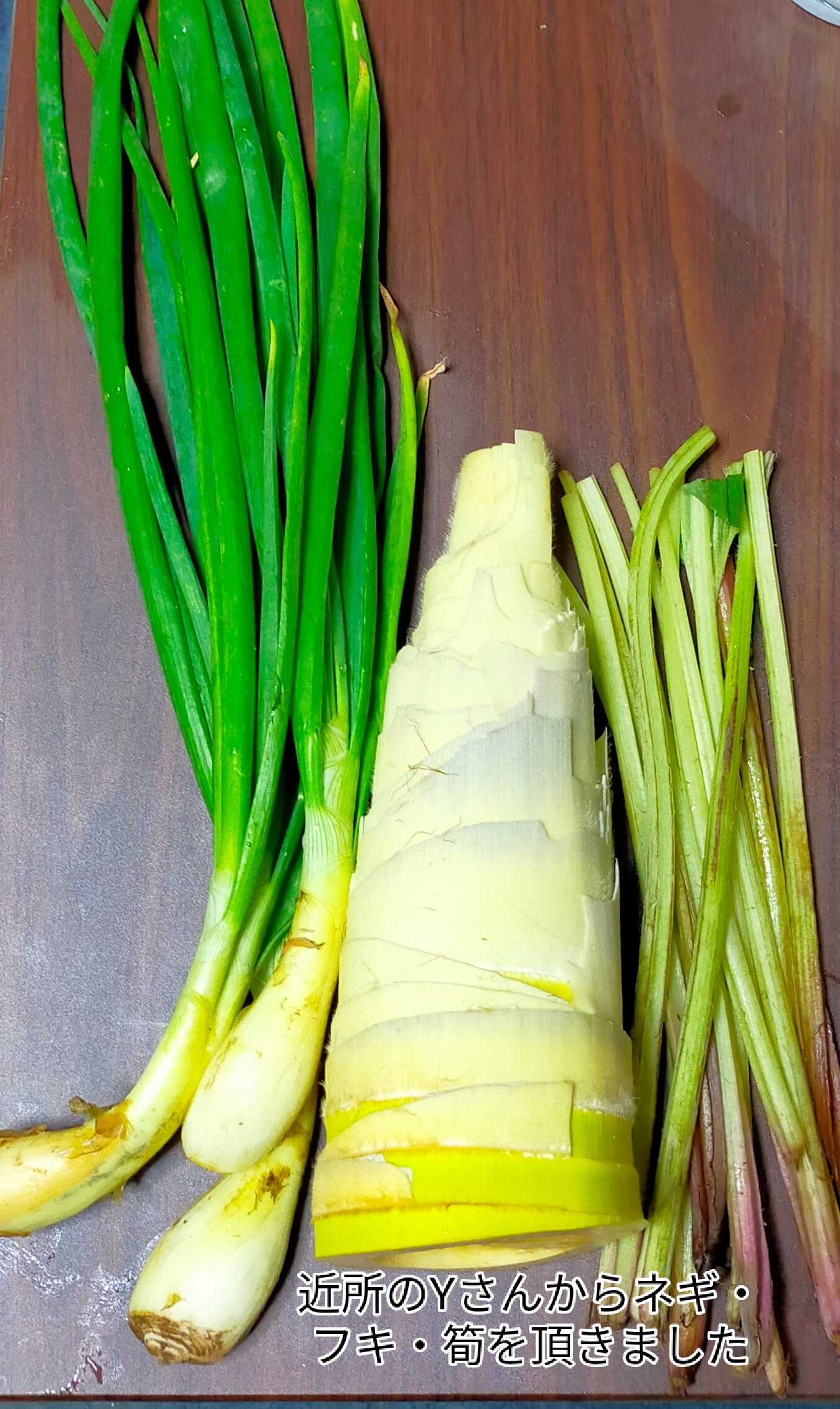 帰宅したら近所のYさんが筍とフキとネギを届けてくれました