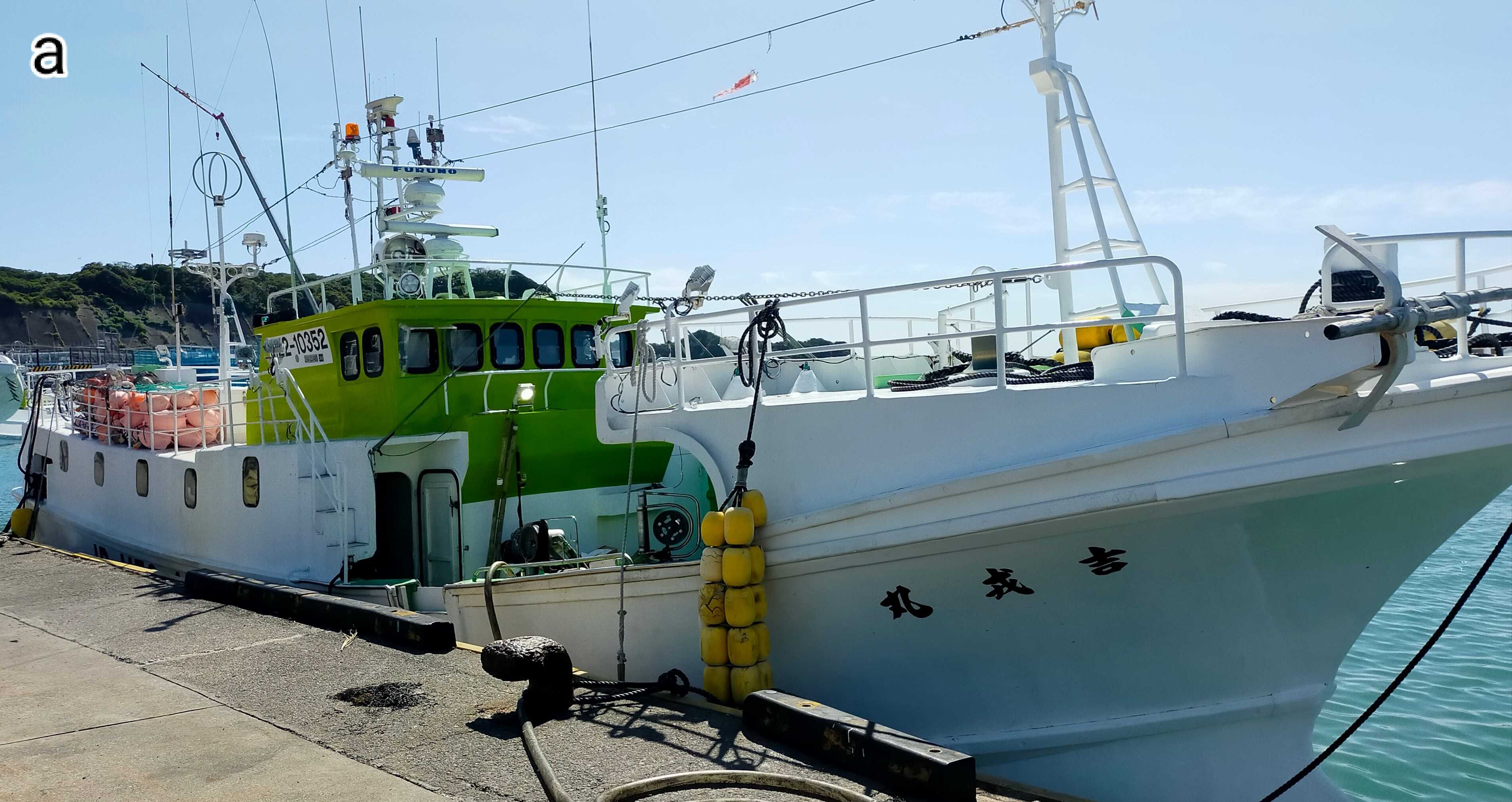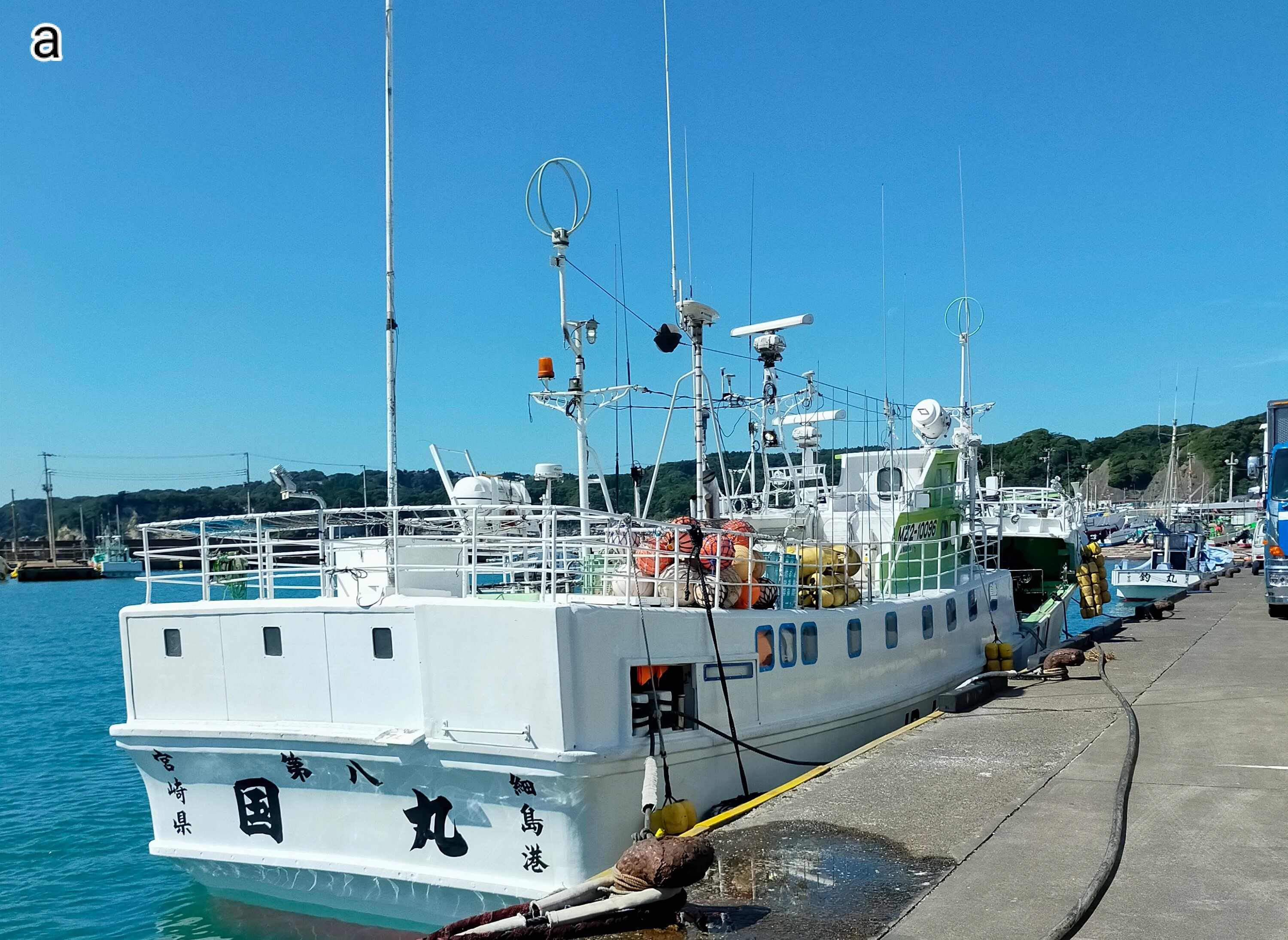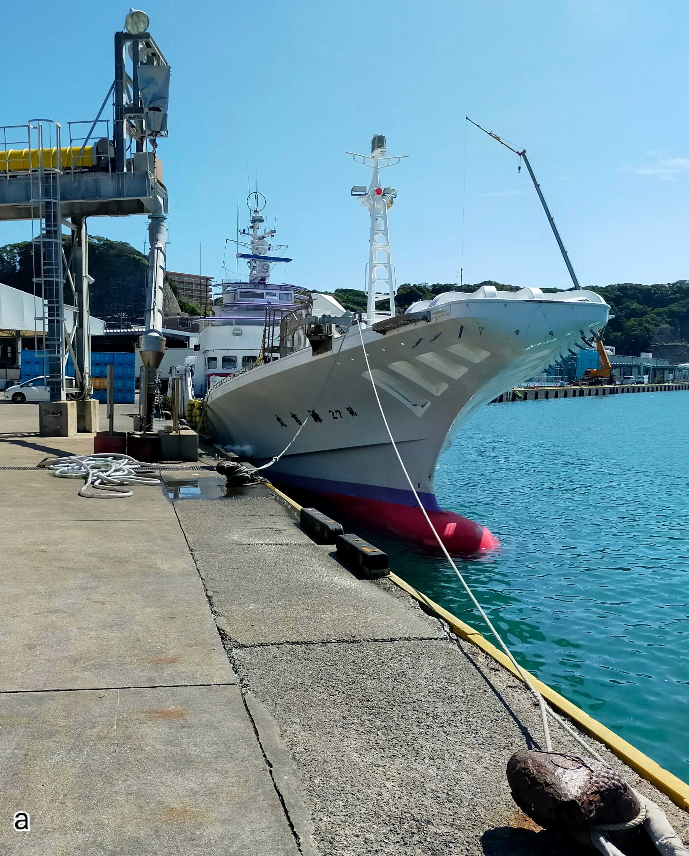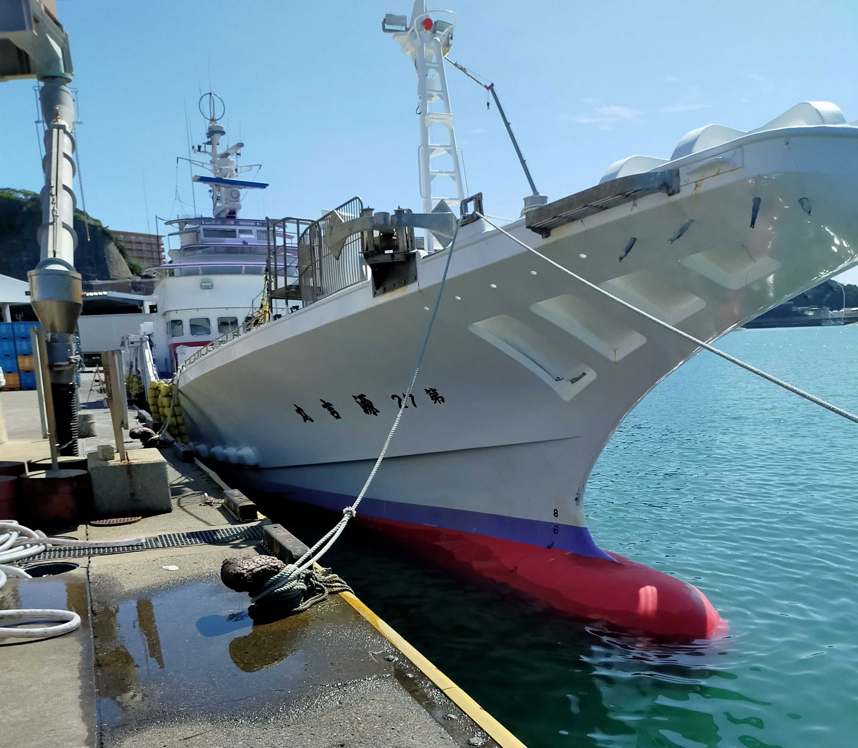 大きな漁船の船首の水切りのアーチがカッコイイ