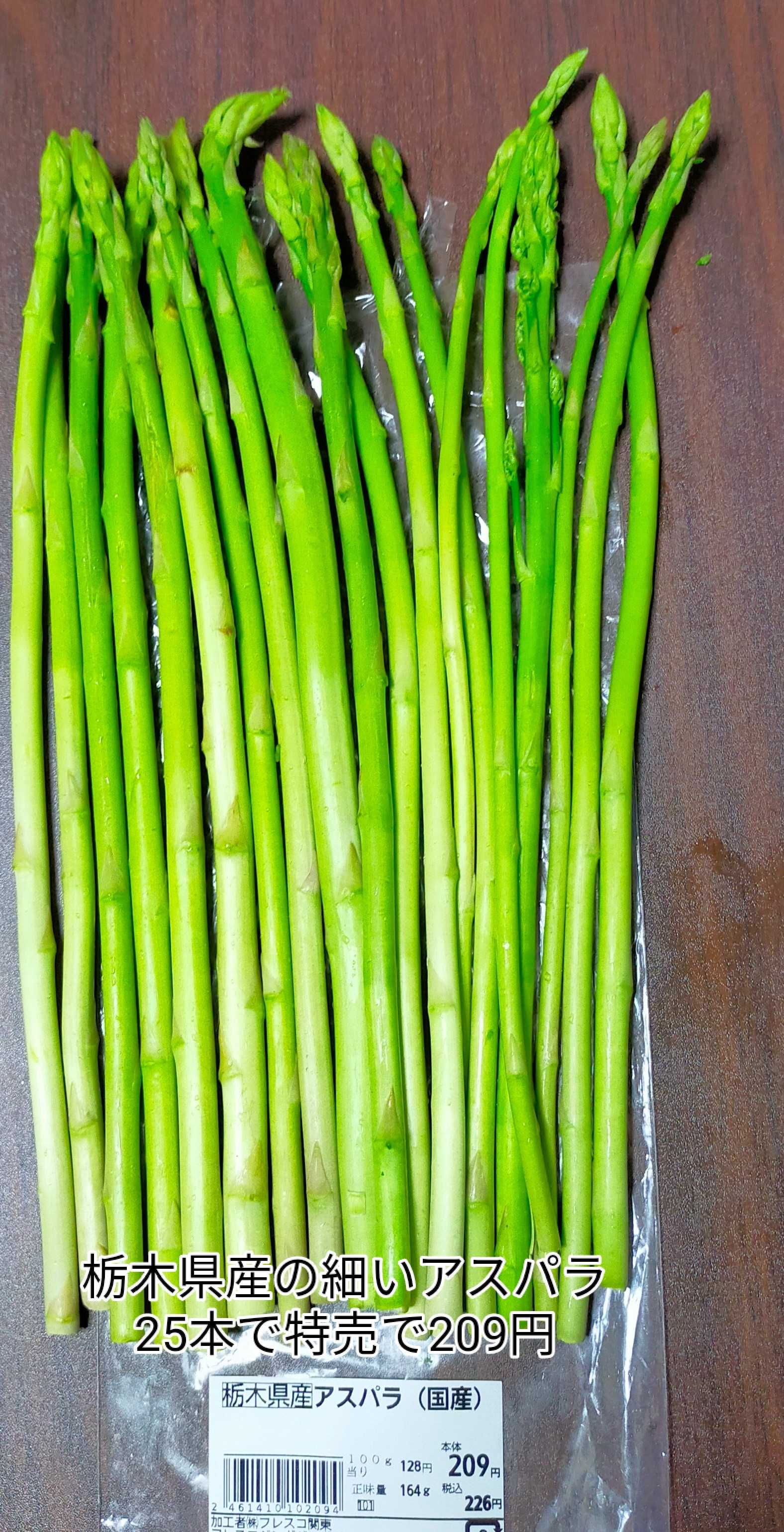 スーパーで栃木県産細いアスパラが25本で特売226円