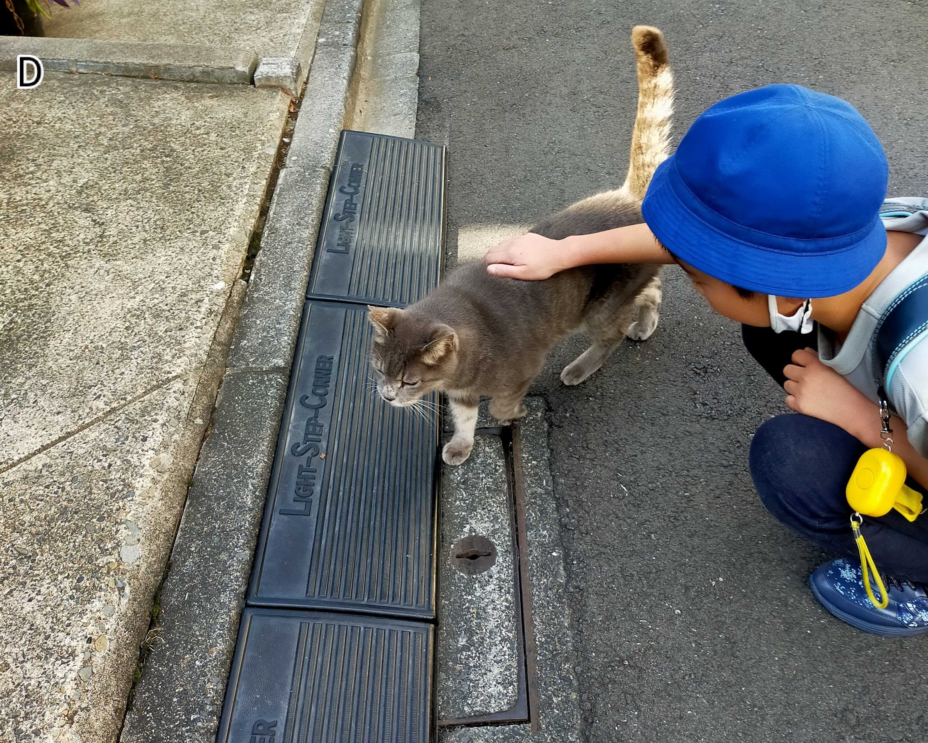 下校した小学生が地域猫ちゃんを見てナデナデしました
