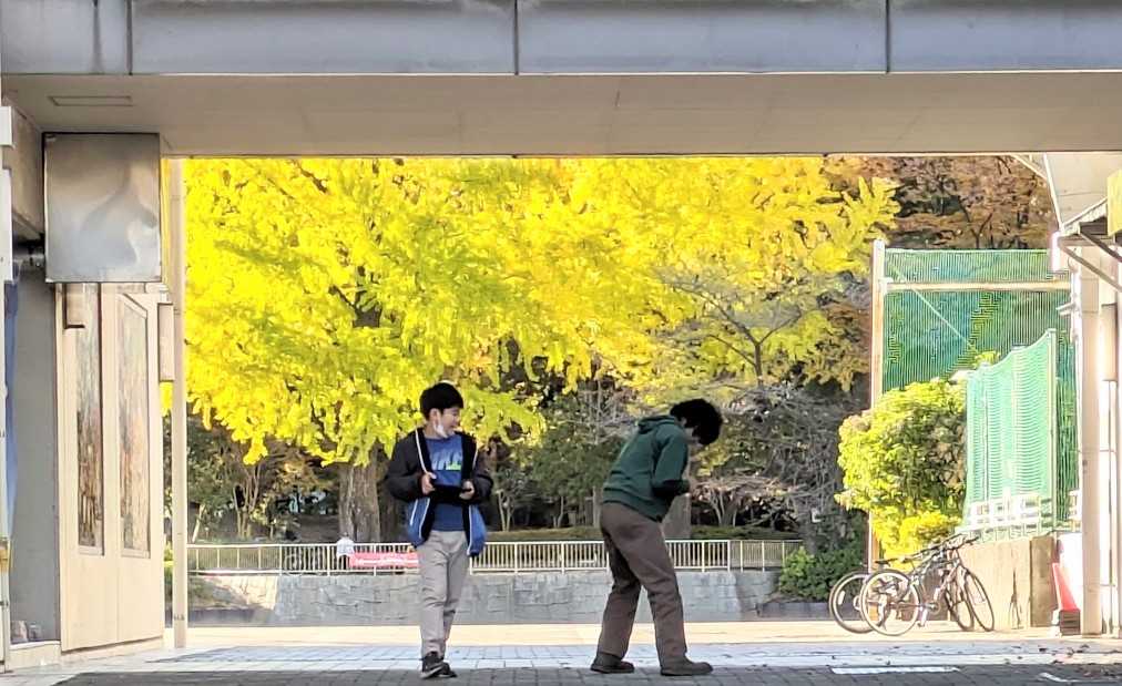 2人の小学生が遊んでいる所を銀杏の黄葉をコラボ撮影