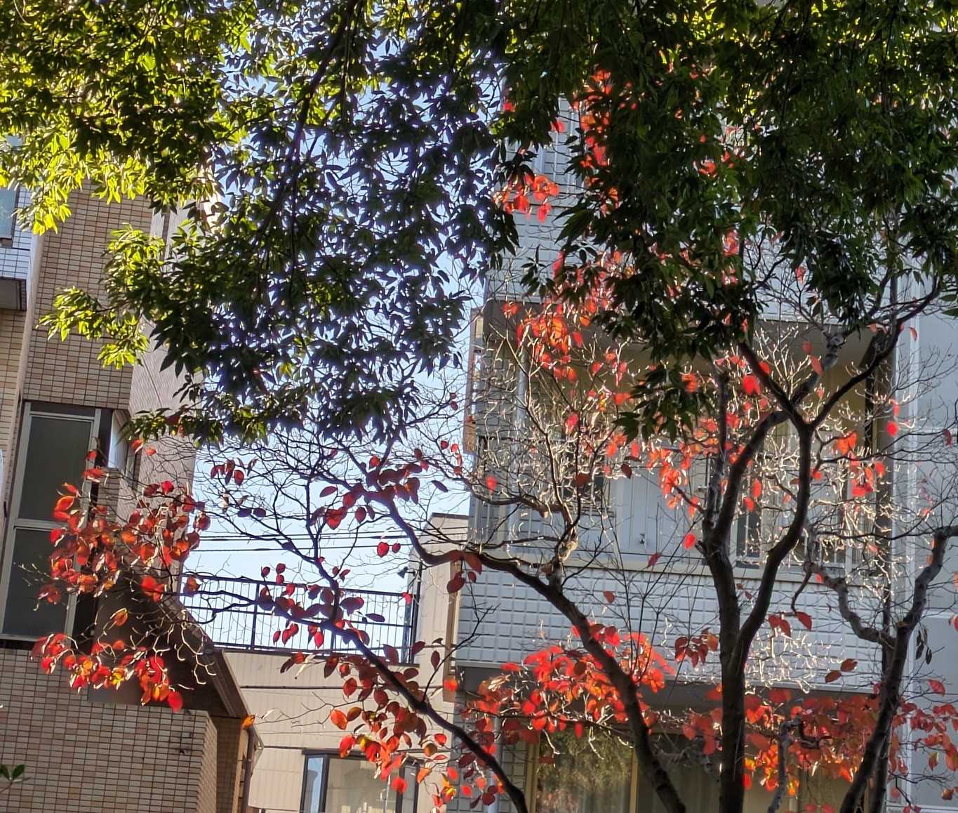 15:30頃蚕糸の森公園の撮影が終わり帰り道に赤い葉の紅葉が逆光で光ってとっても綺麗でした