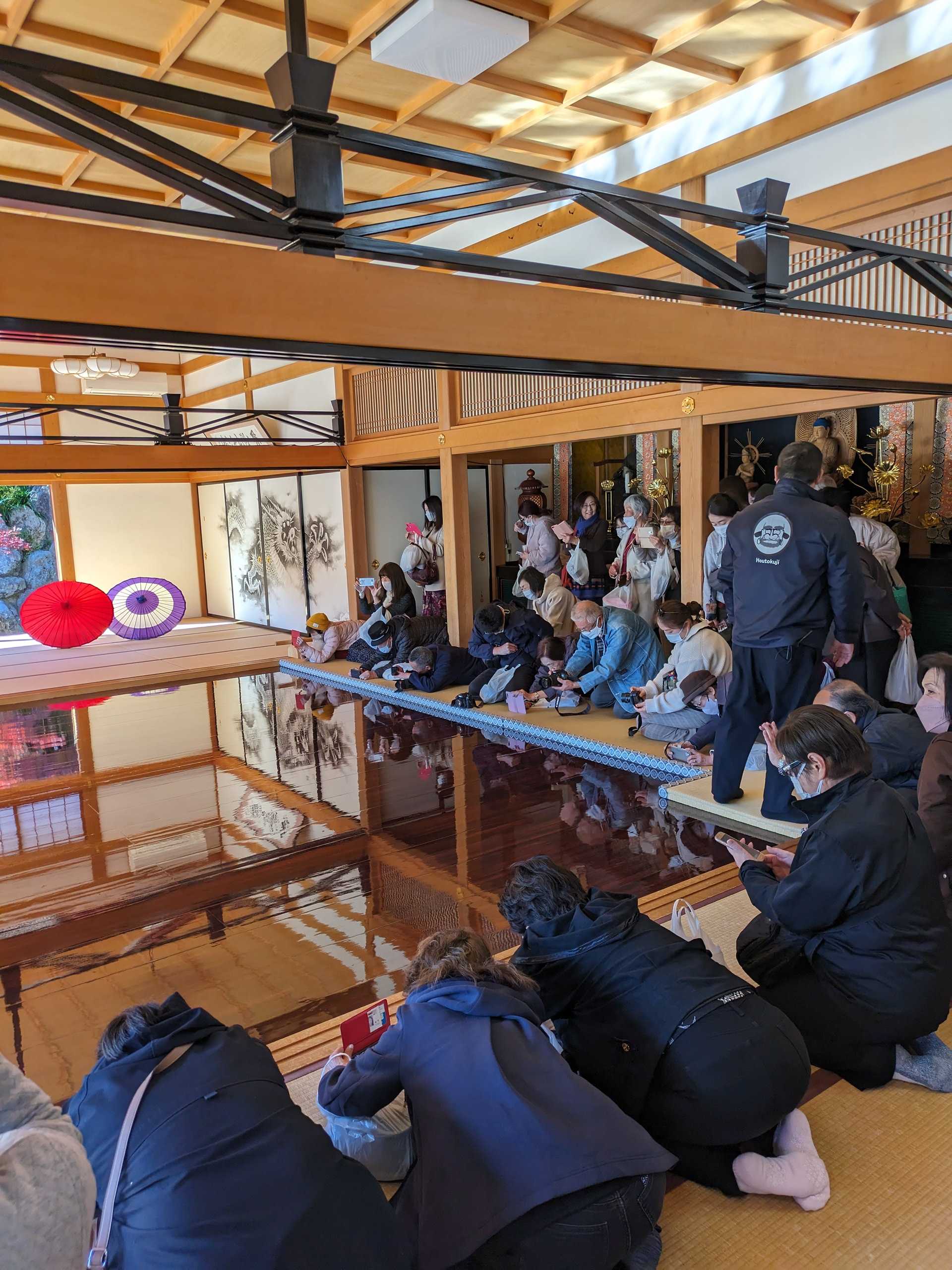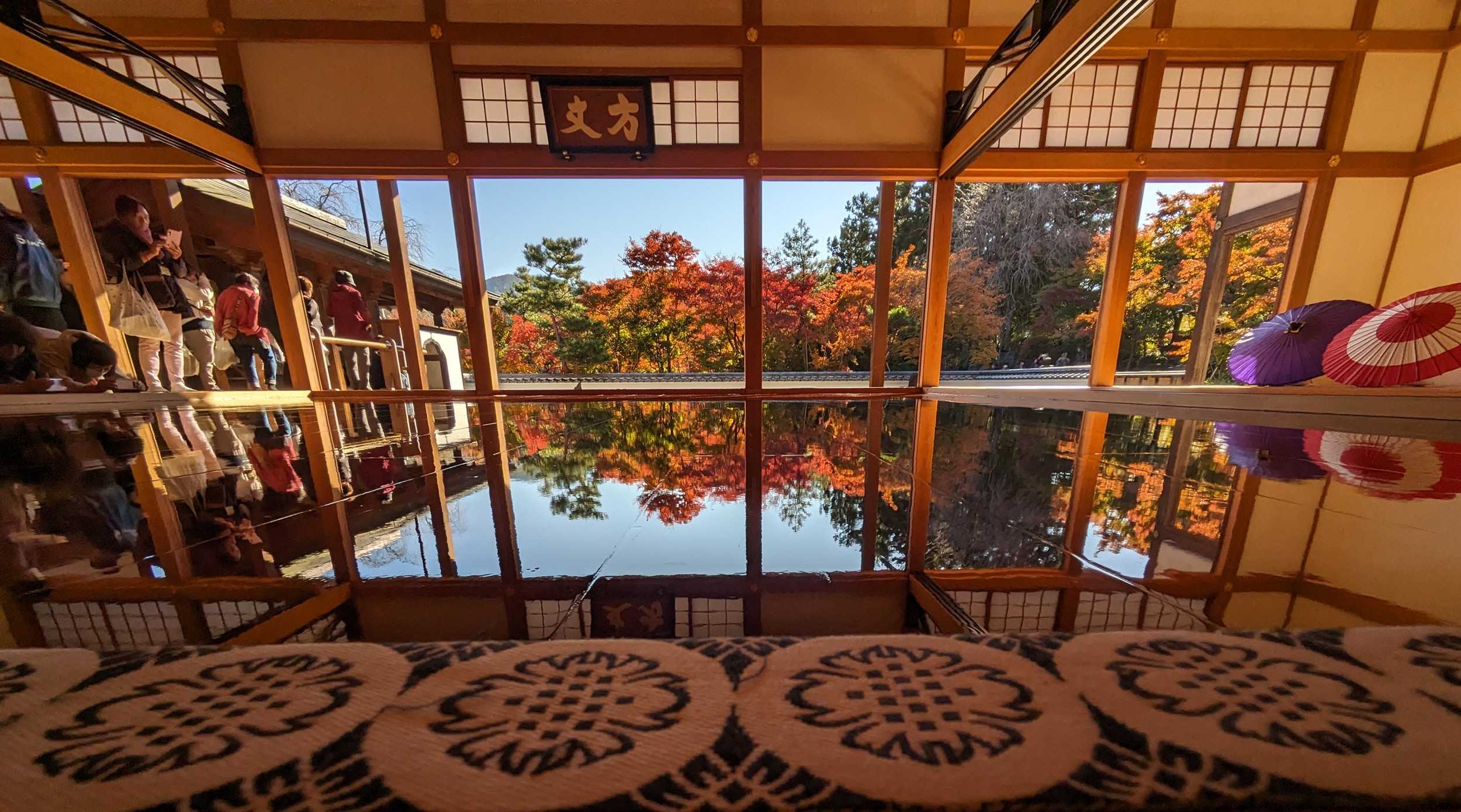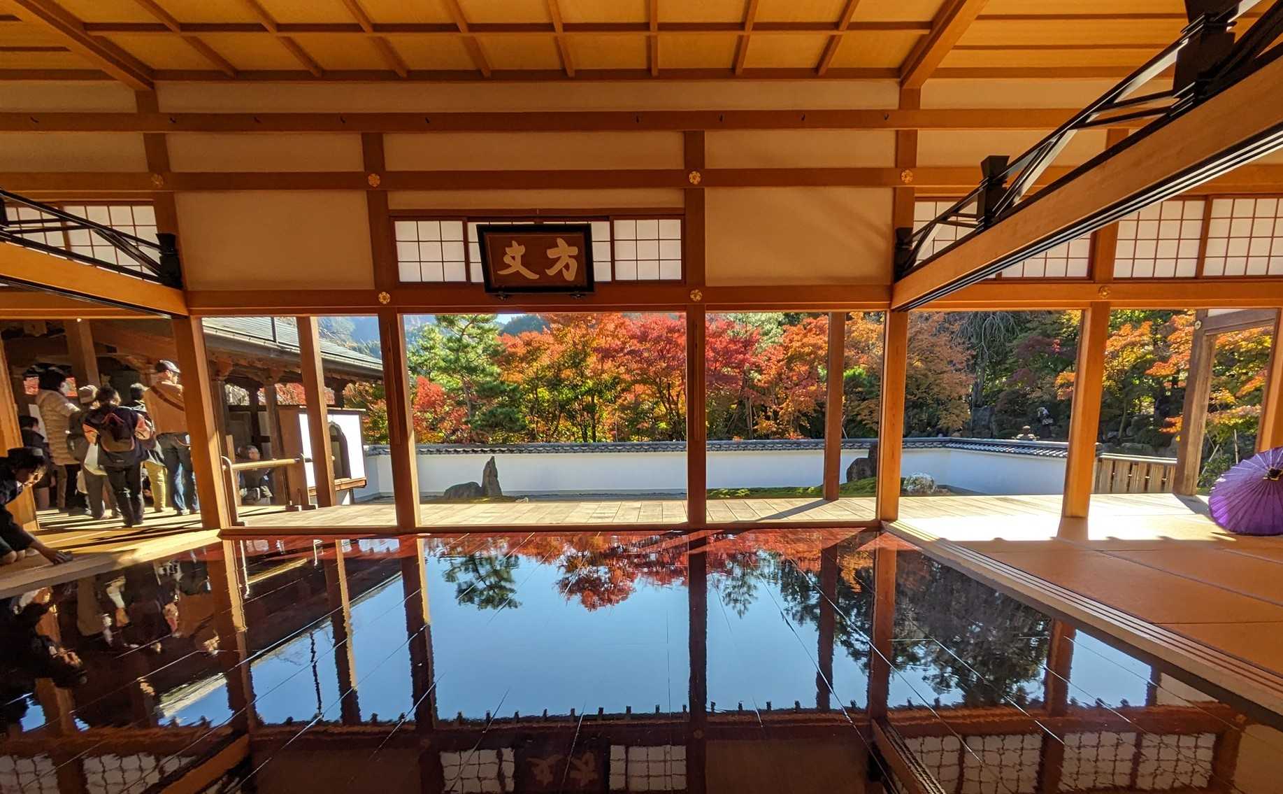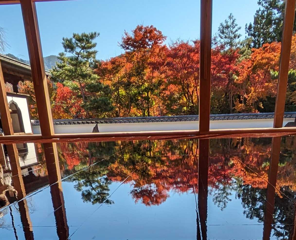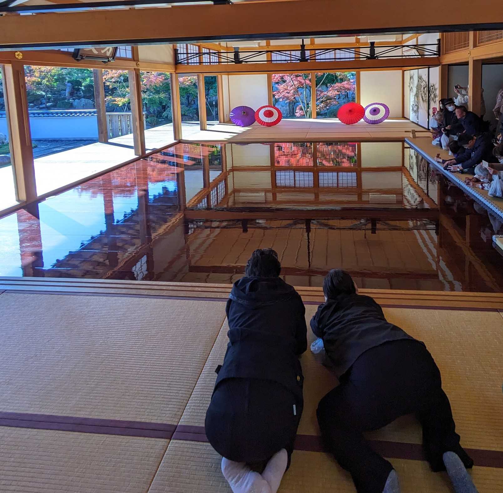 畳に寝転んで床もみじ🍁を撮影すると紅葉が黒い床に綺麗に映り込みます 黒い床は檜に黒漆を塗っていますたくさんのテレビ局が床もみじ🍁を放映していました