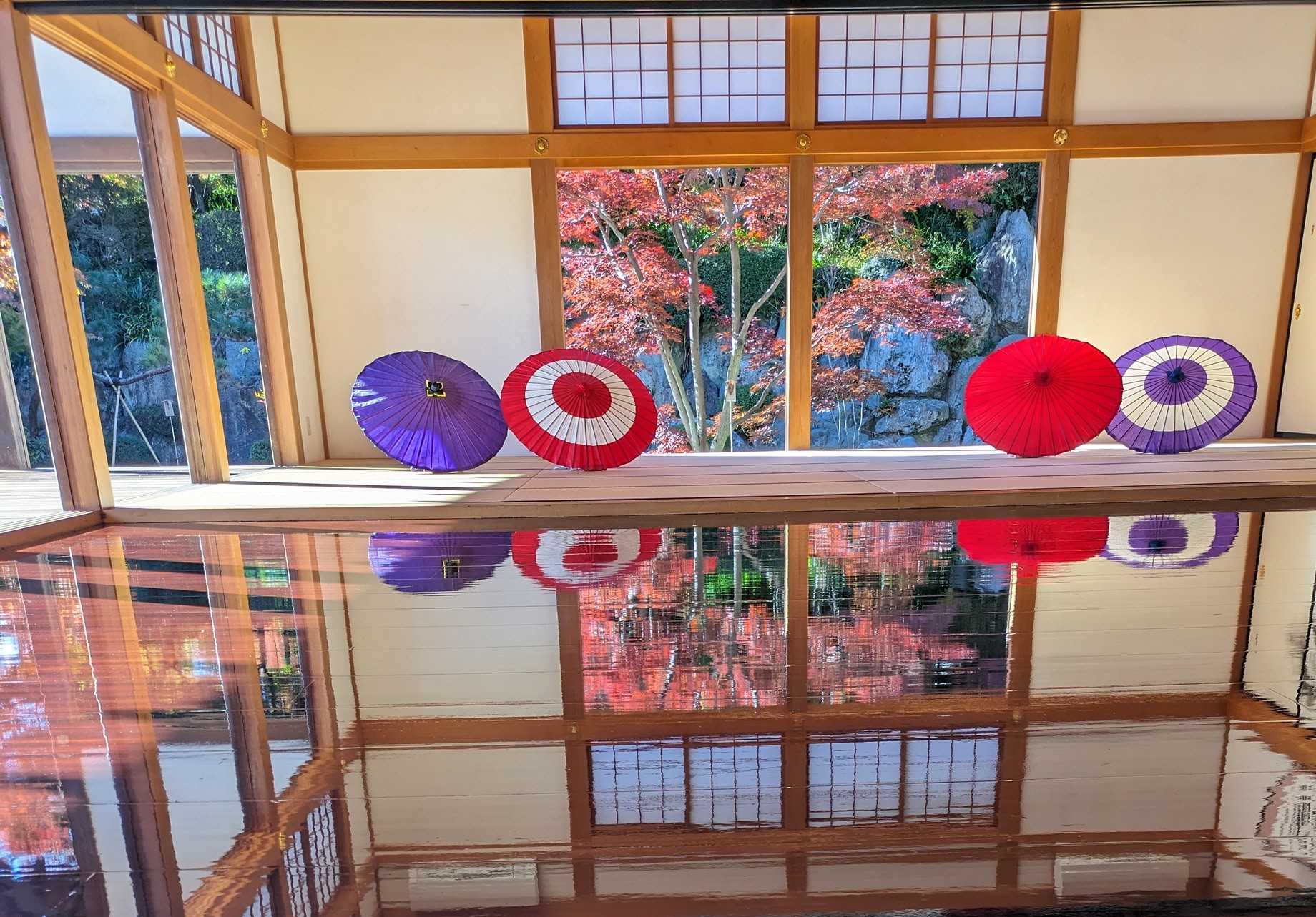 正面左側の床もみじ🍁と和傘をアップ撮影しました