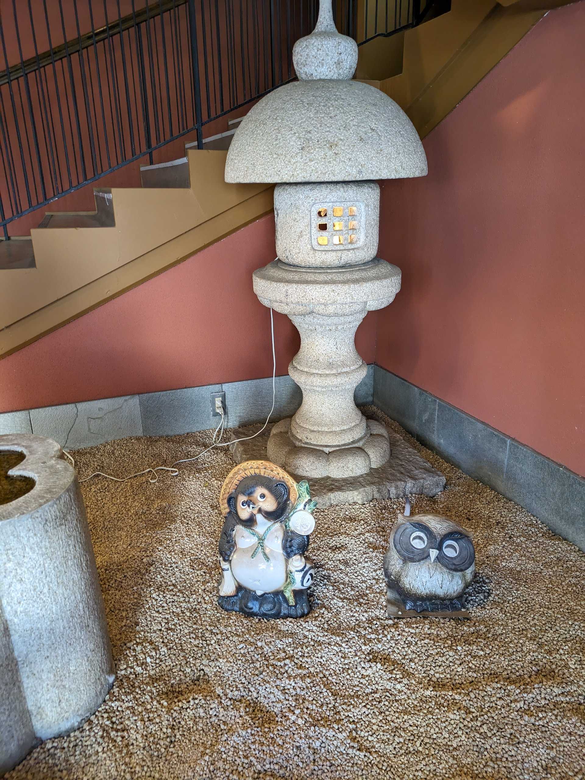 昼食会場の美喜仁入口には 石灯籠 たぬき フクロウの置物