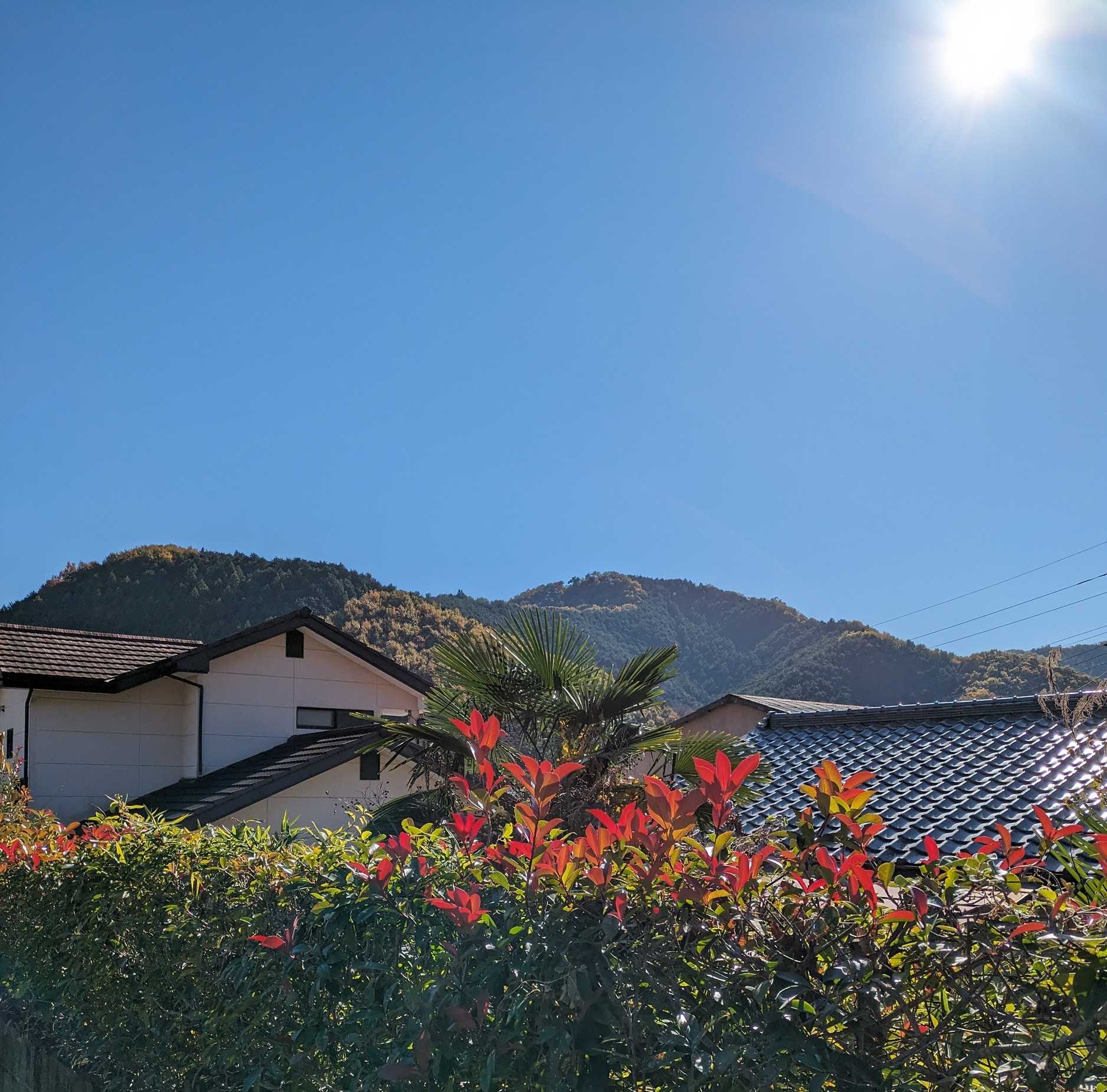 赤く紅葉した葉が鮮やかで綺麗なので背景に山を入れて撮影