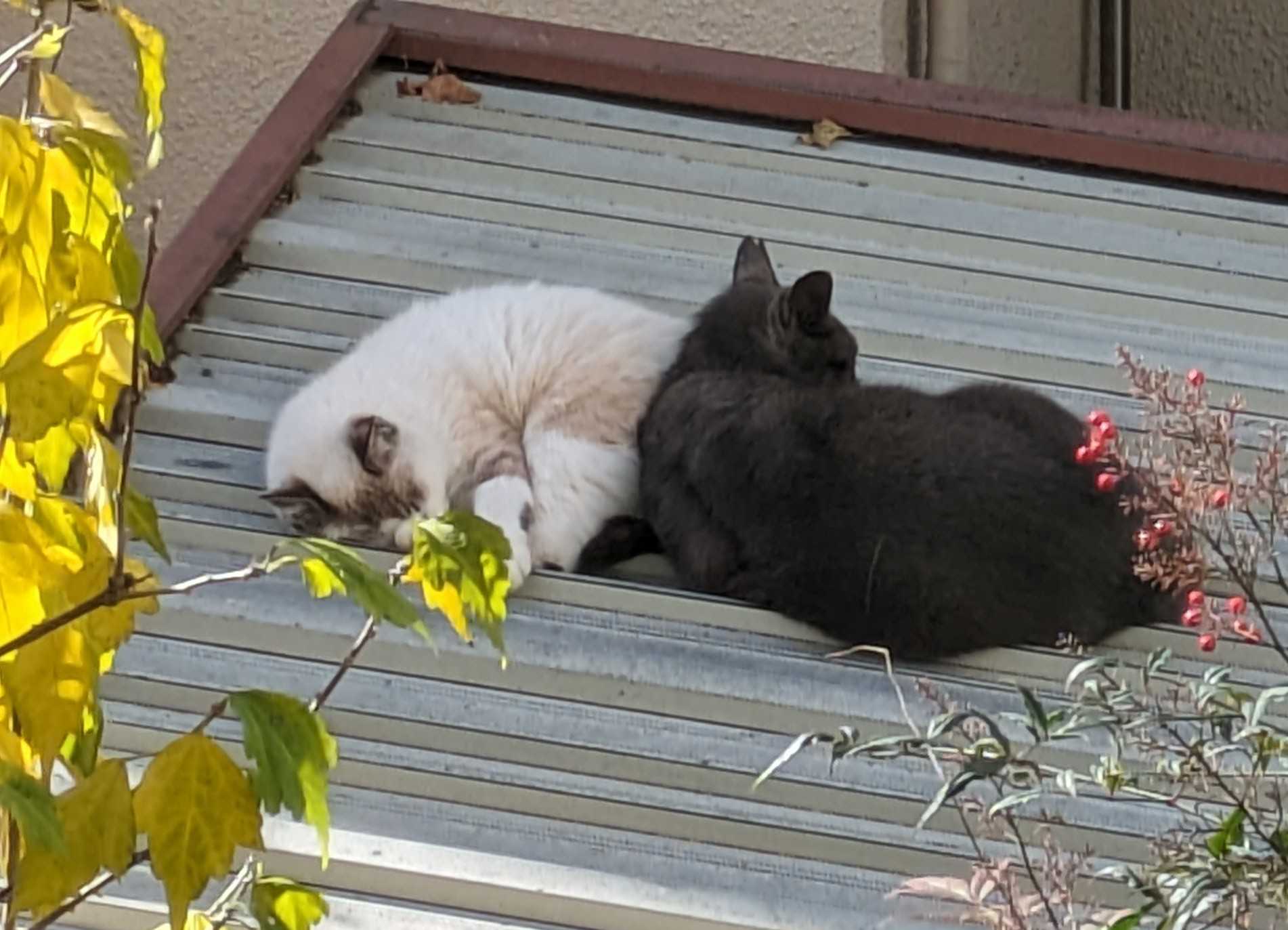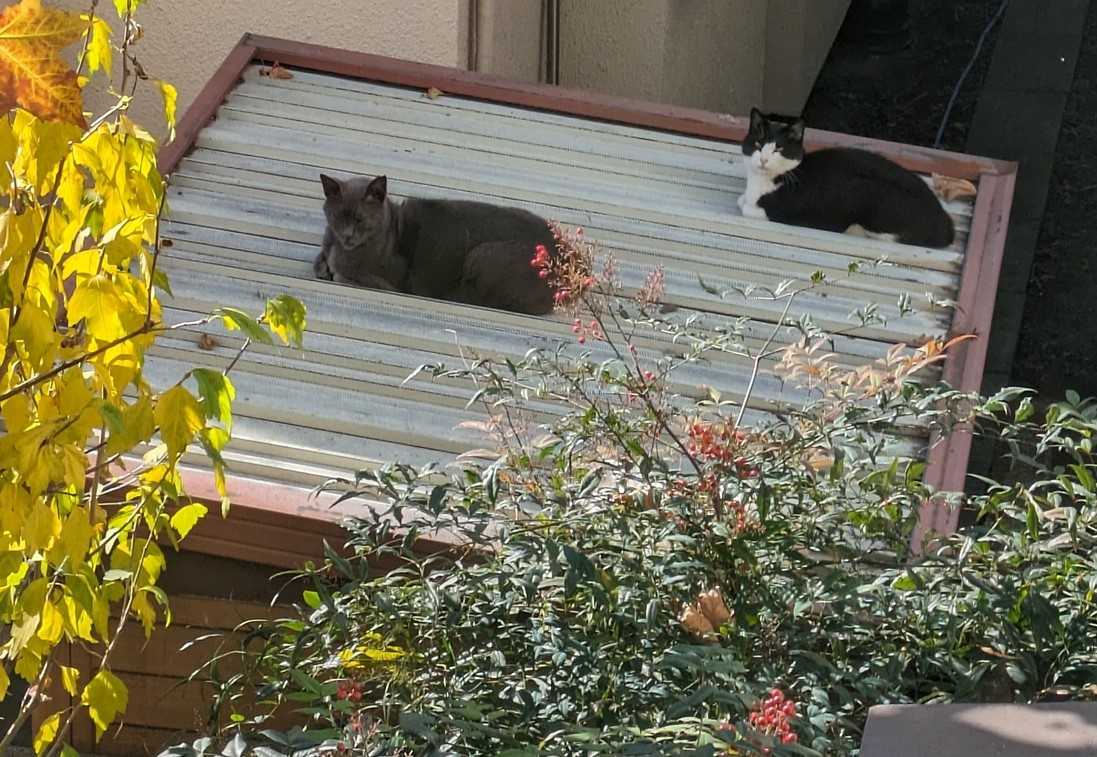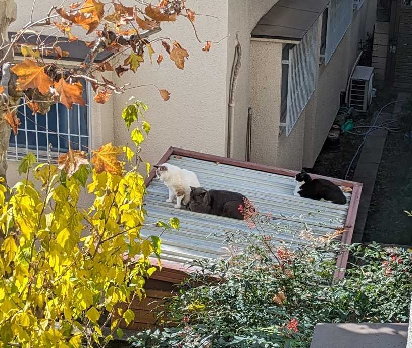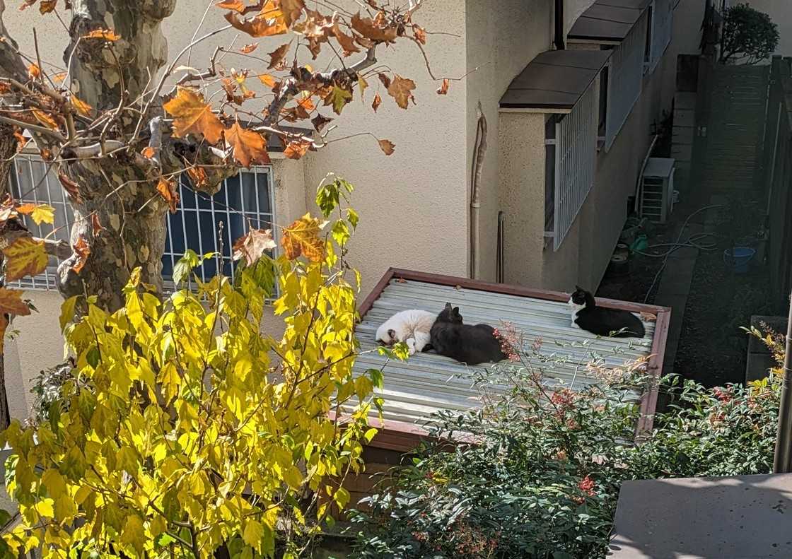 自宅の2階から向かいの物置の屋根に地域猫3匹が日向ぼっこ