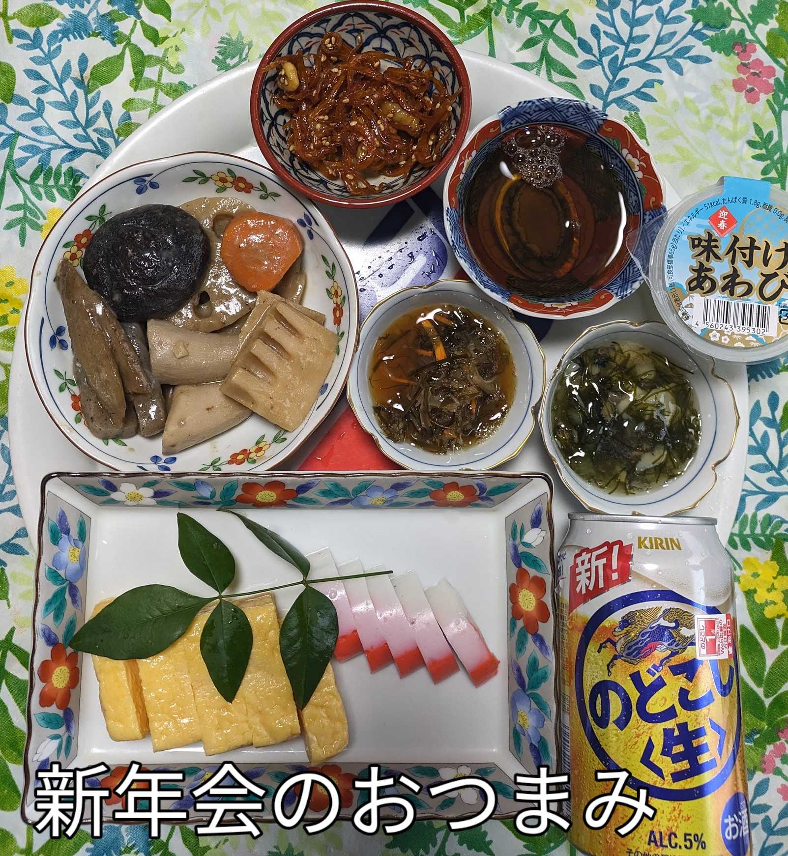 男料理 自宅に帰宅してから妻と親友Nさんと3人で新年会 お煮しめ 味付けあわび他小鉢 蒲鉾と厚焼き玉子 ビール