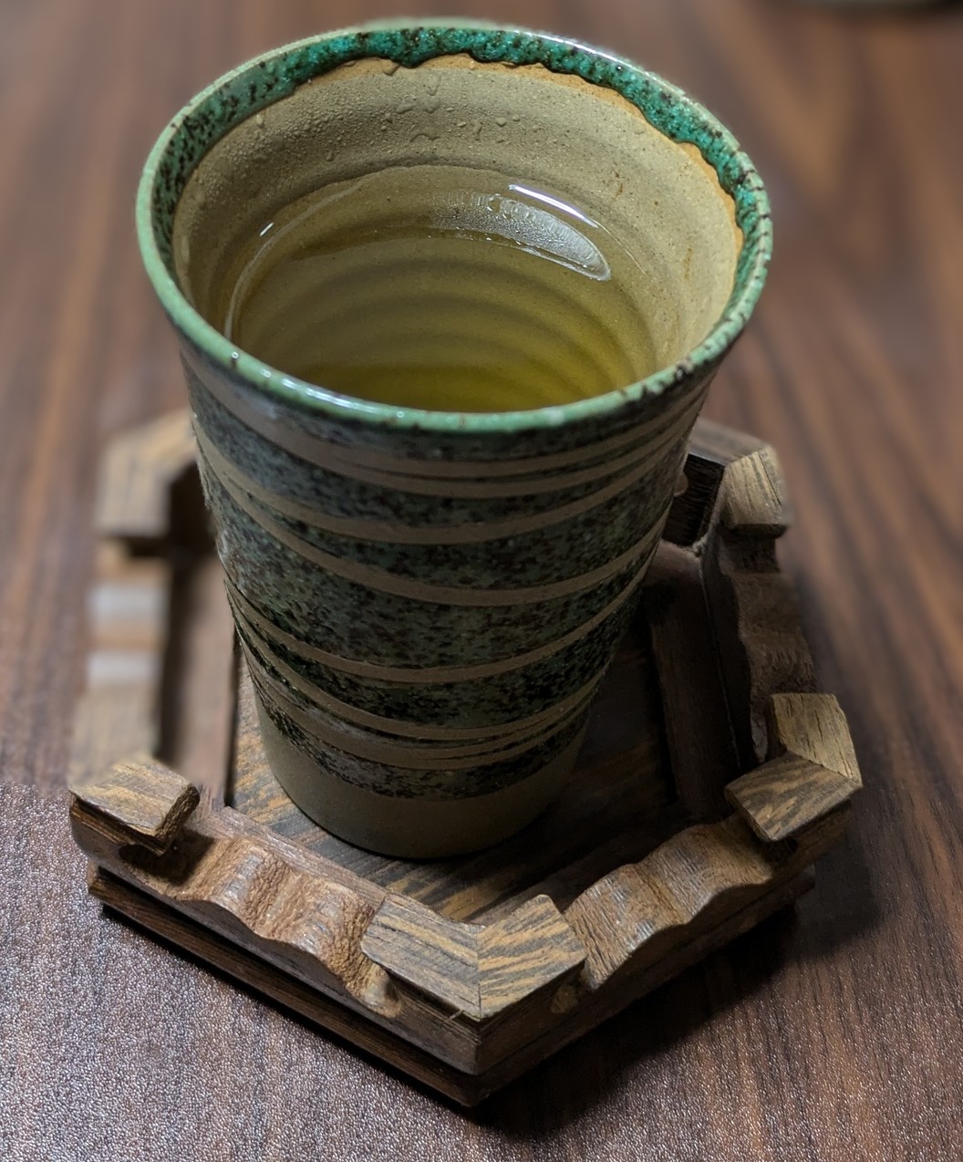 下の木作りの30円のコースター 江戸切子風のグラスを置きました