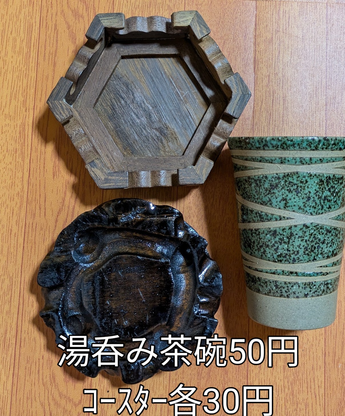 フリマで50円の湯呑み茶碗とフリマで30円の六角形のコースターです