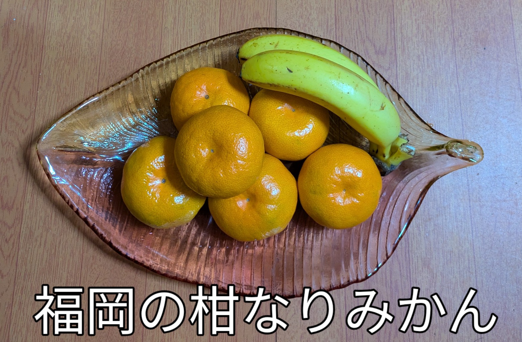 フリマで200円で買ったガラスのフルーツ皿にみかんとバナナを盛る
