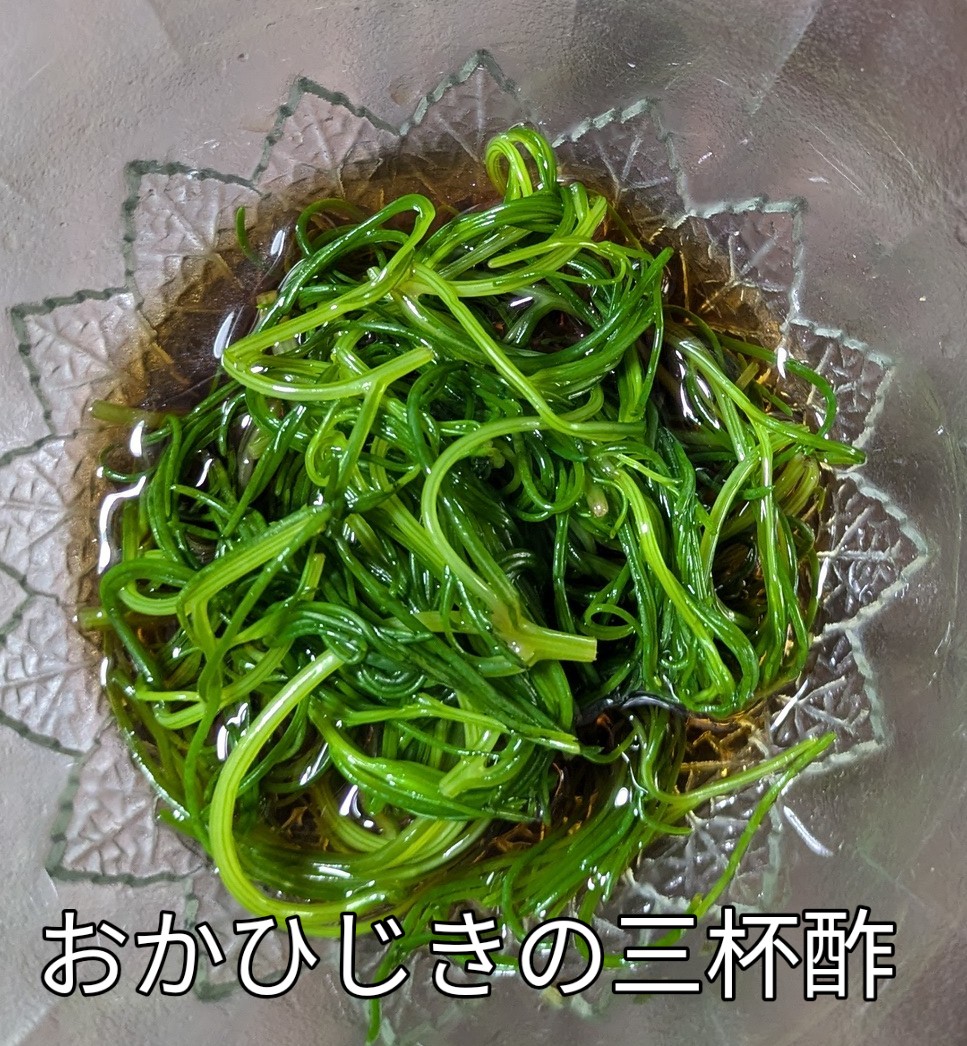 おかひじきを少し塩を入れた熱湯で1分茹でました ラーメンに入れたり おかひじきの三杯酢を作りました さっぱりしてシャキシャキの食感が美味しかったです おかひじきは お刺身のつまにも使えます