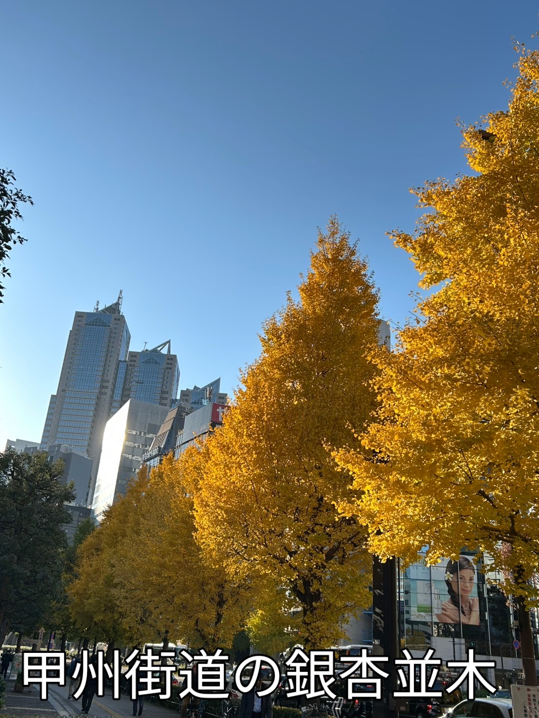 甲州街道の銀杏並木 黄葉が輝いて綺麗 背景は新宿パークハイアットホテルです 文化服装学院勤務の友人SさんがLINEで送ってくれました