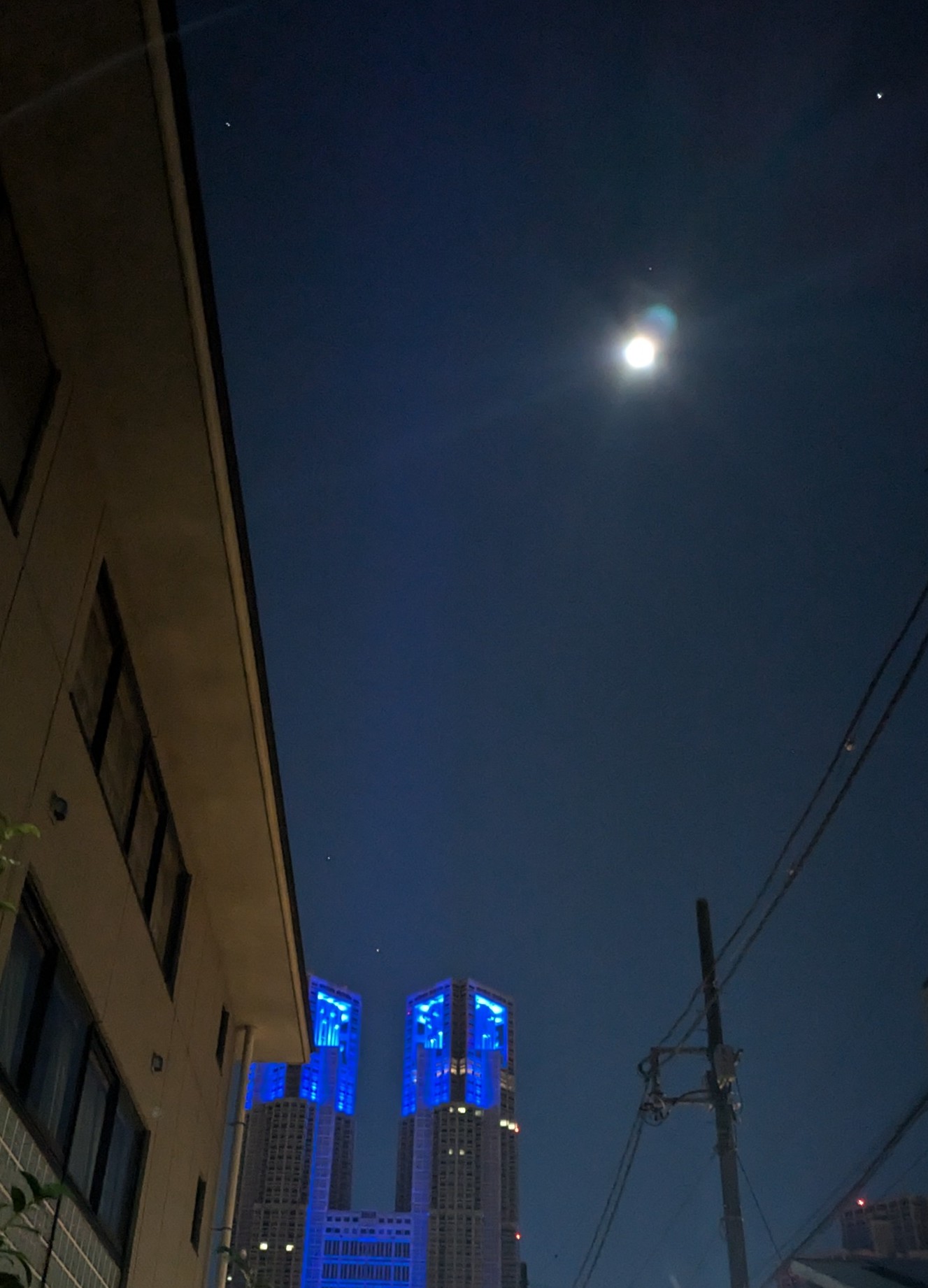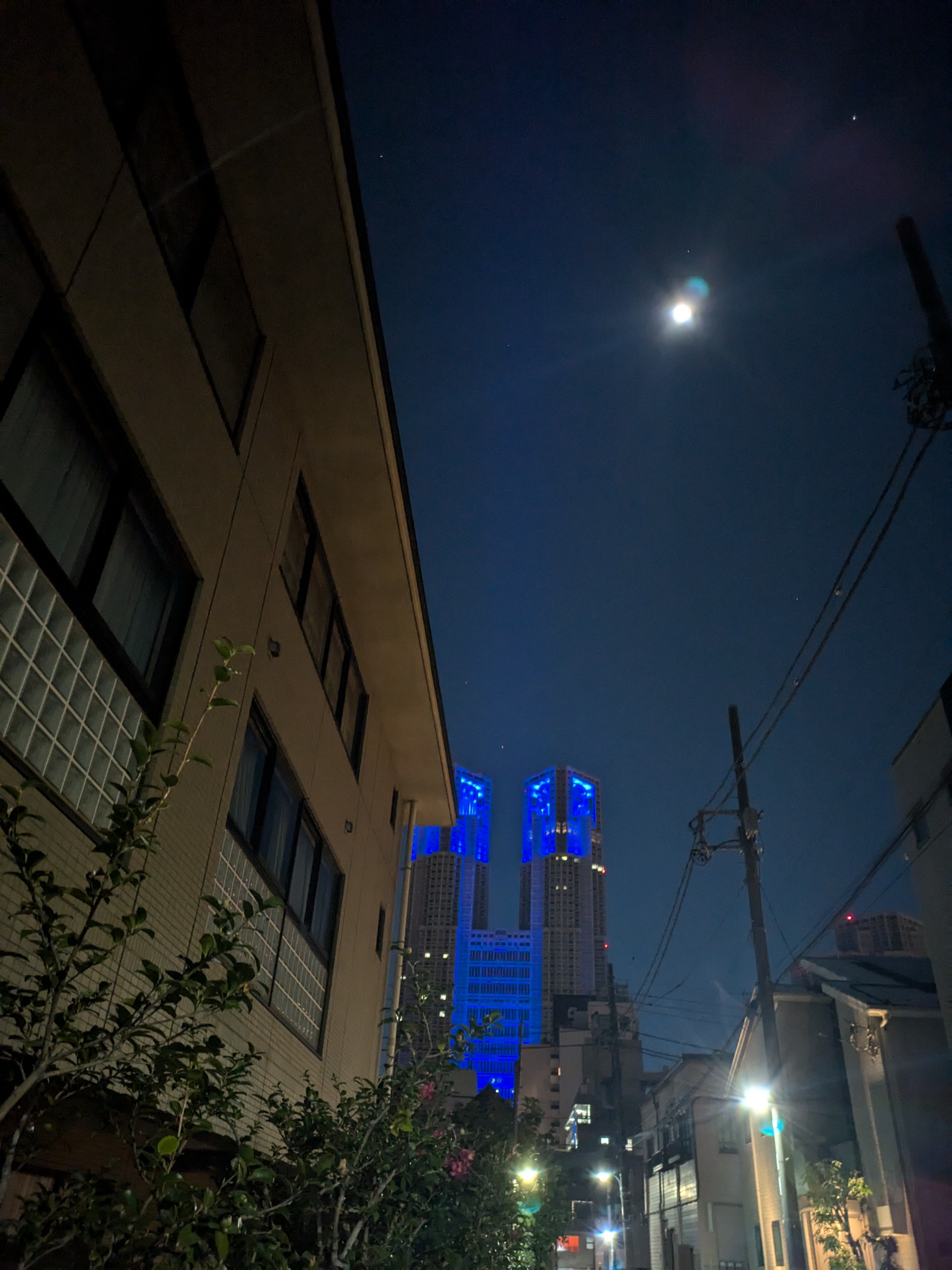都庁がブルーのライティングに変わったのでコールドムーンとコラボ撮影