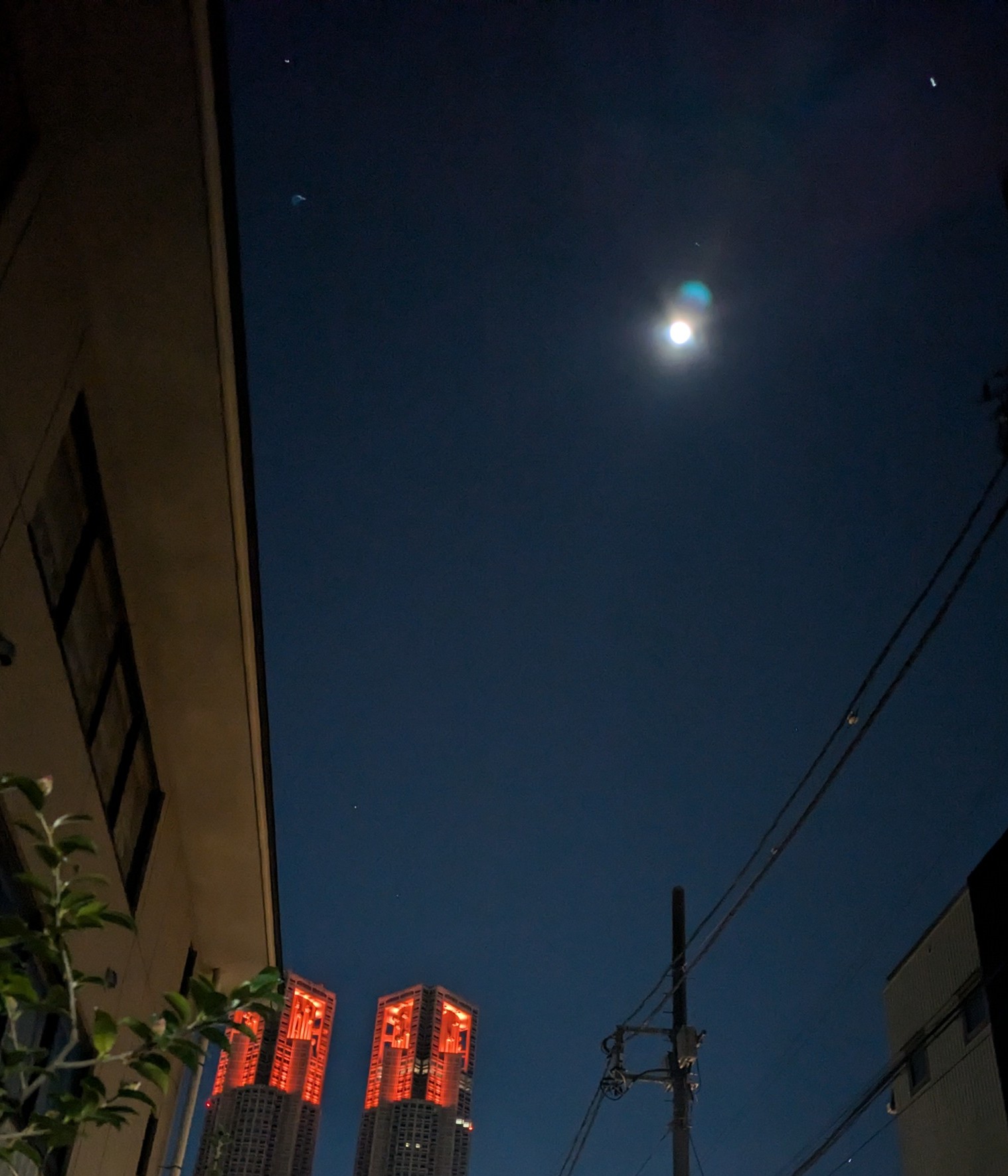 12/15に自宅前の道路から赤いライティングの都庁とコールドムーンを