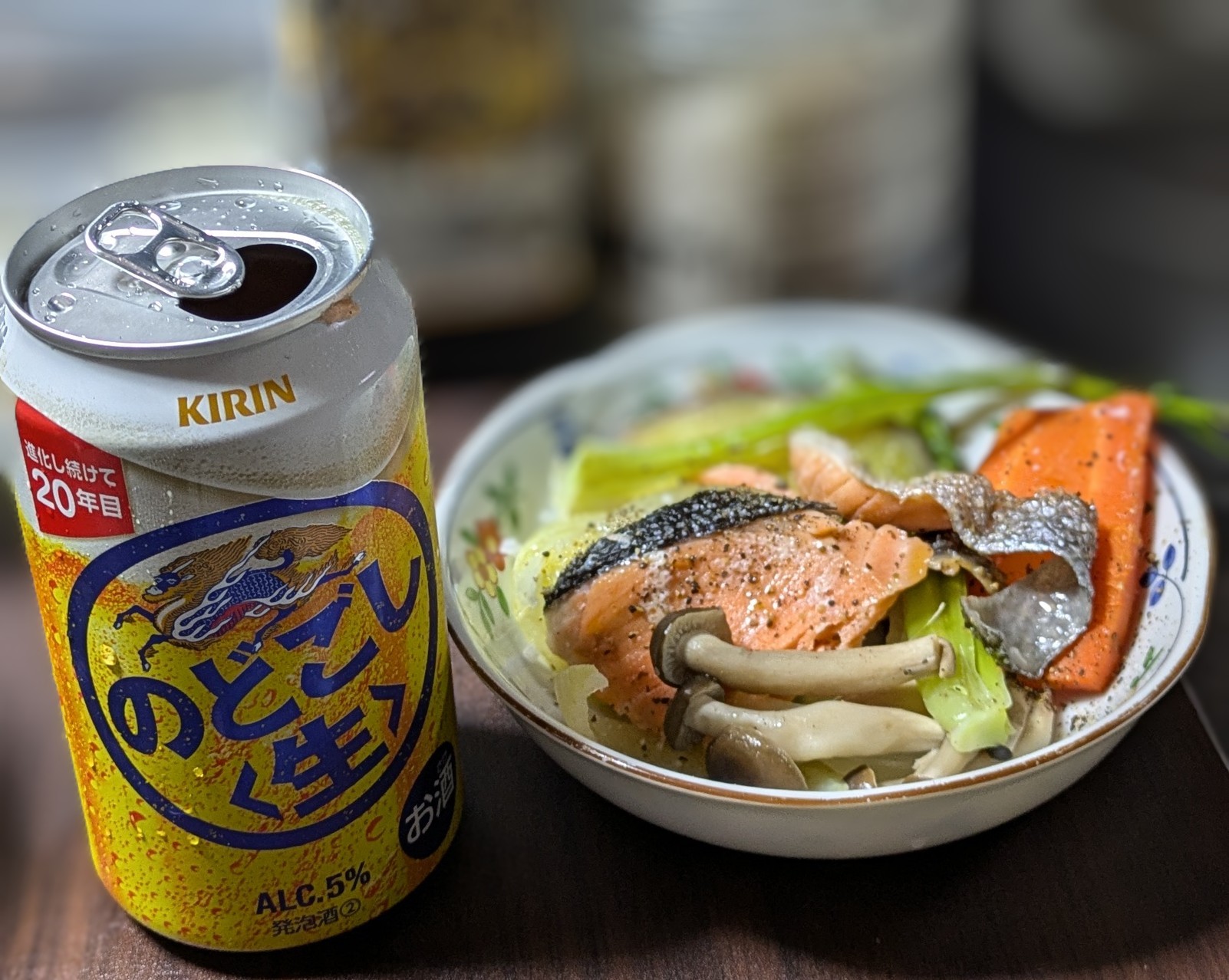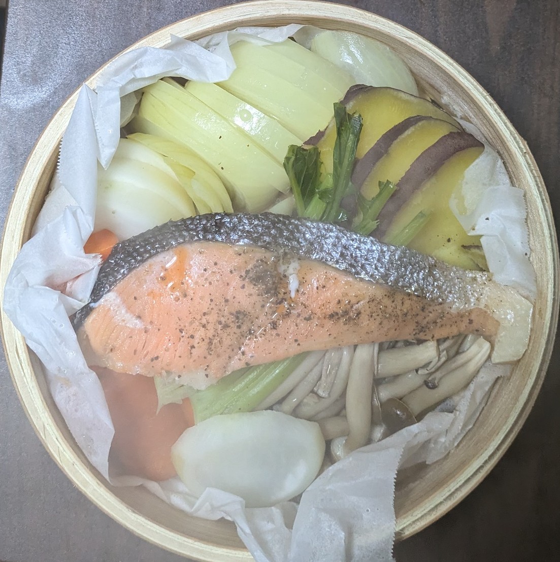 11/03の渋谷フェス唾で買った蒸籠を使い鮭と野菜を蒸しました