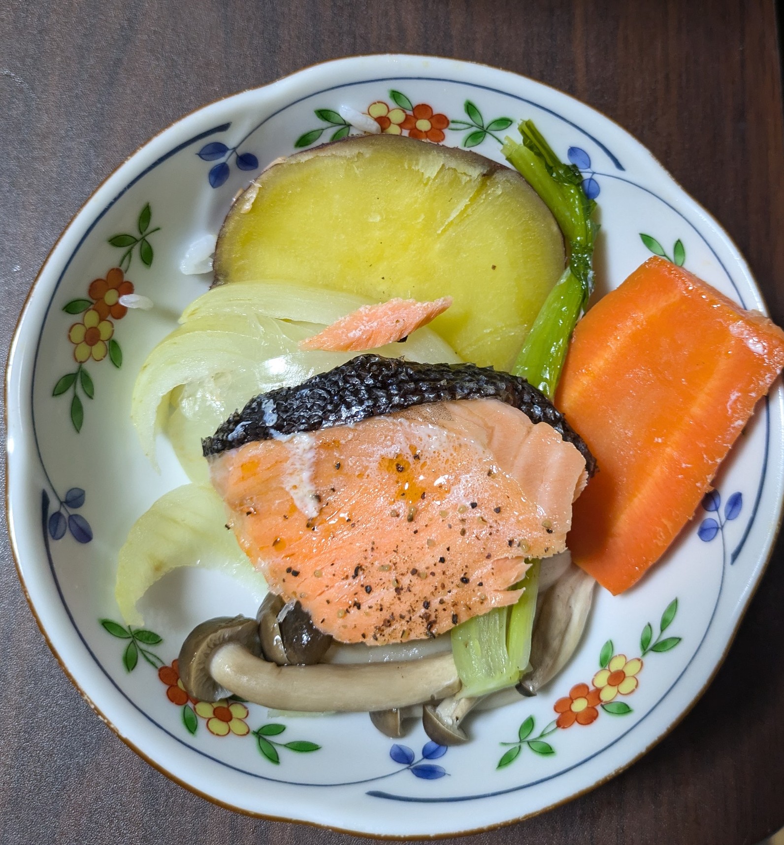 男料理(夕食)鮭と野菜の蒸籠蒸し さつま芋 玉ねぎ しめじ 人参