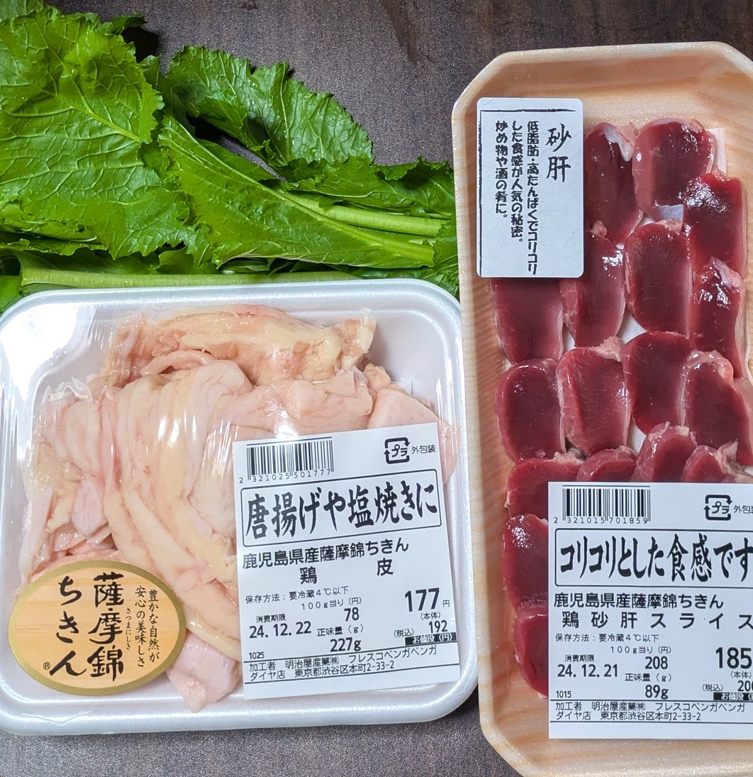 鹿児島県産薩摩錦ちきんと鶏砂肝スライスを近くのスーパーで買う