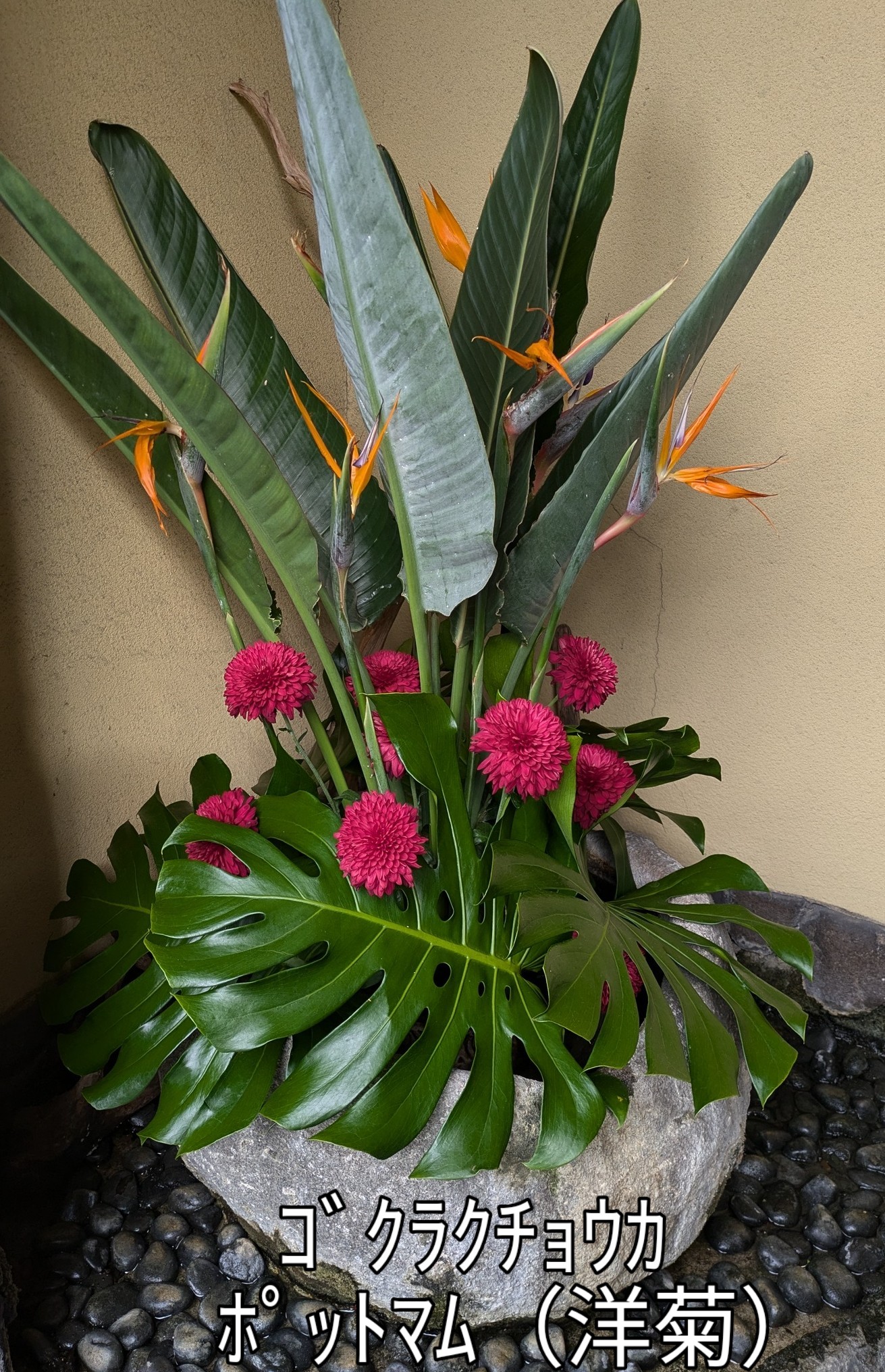 高級料理屋さんの入口に極楽鳥花とポットマムの花が飾られていました