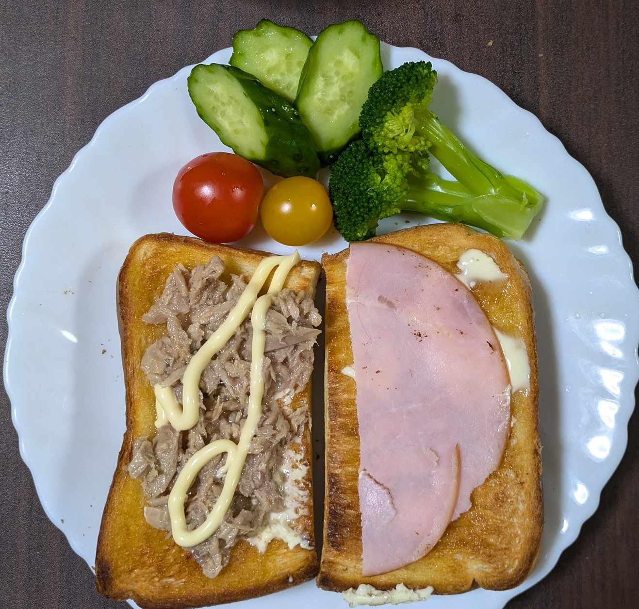 男料理(朝食)ツナとハムを焼いたトーストに サラダ添え