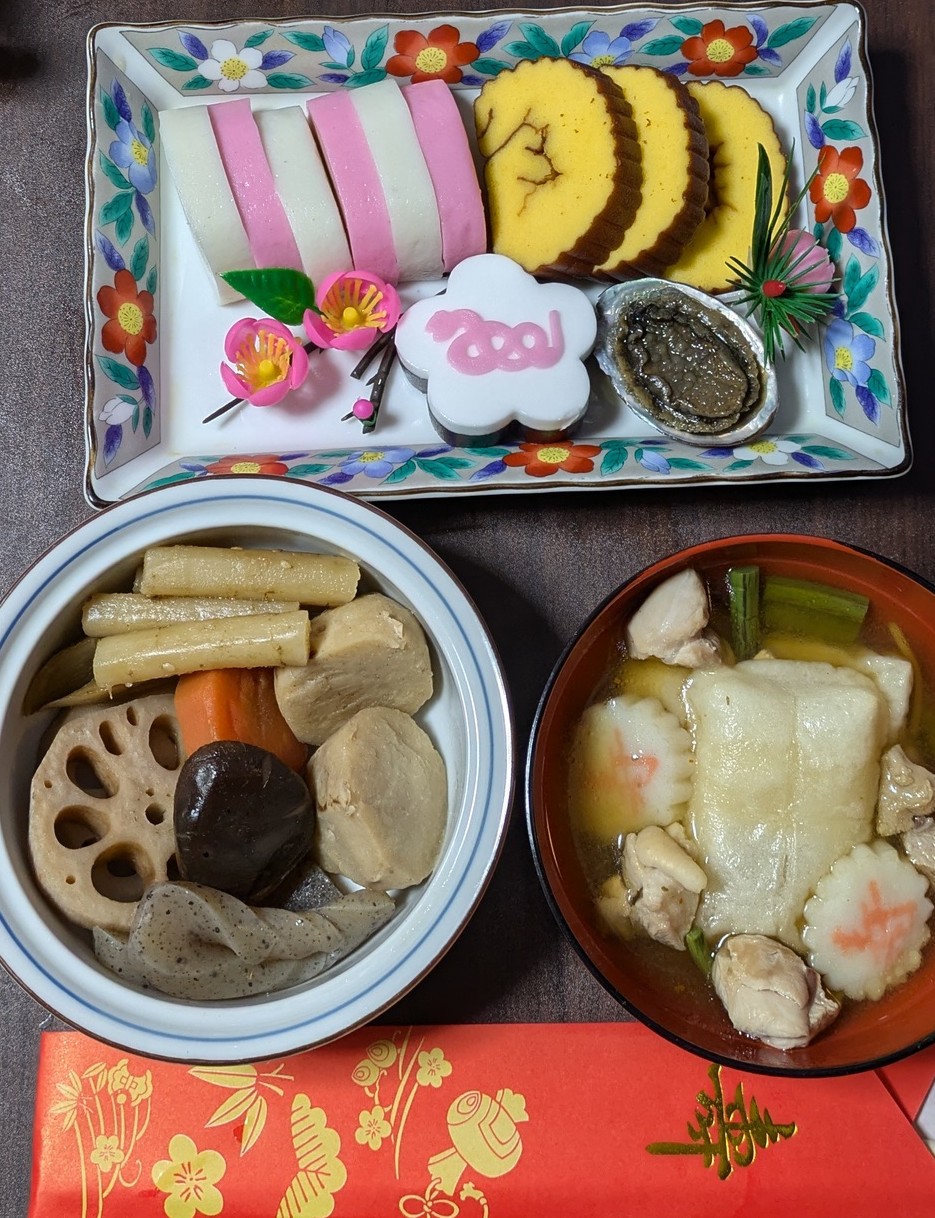 男料理 (元旦の朝食)お雑煮(鶏肉入り) お煮しめ おせち料理 トコブシ 伊達巻 紅白の蒲鉾 ヘビの絵の桜の形の羊羹を飾る