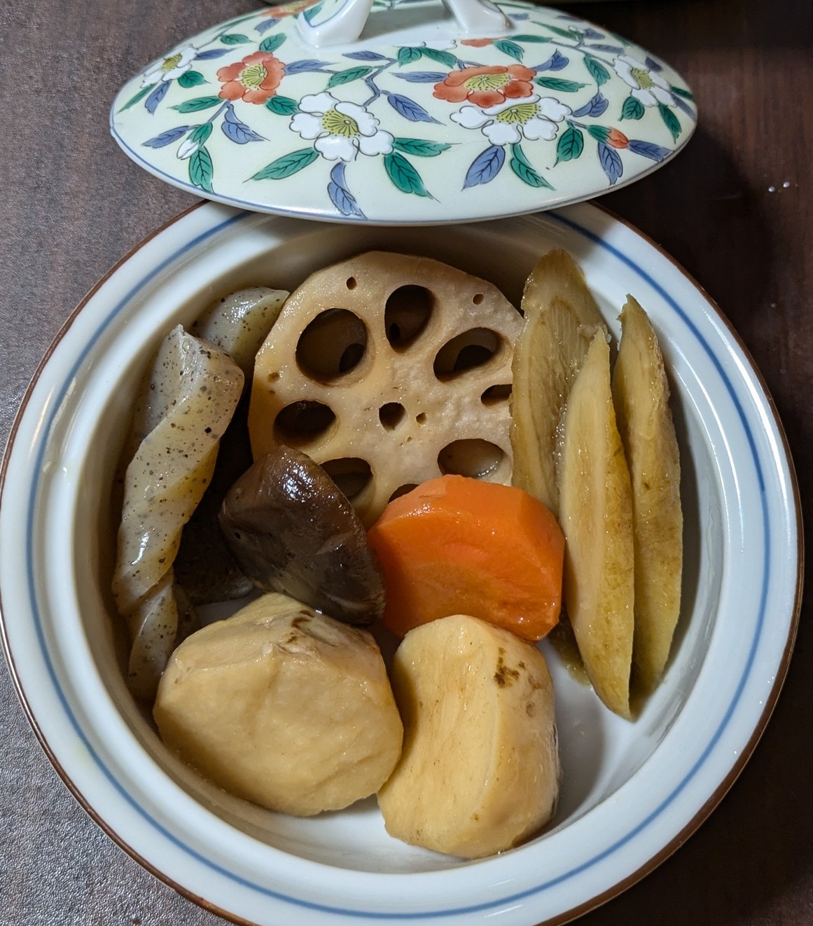 男料理(お煮しめ)ハス 牛蒡 里芋 人参 椎茸 蒟蒻器は11/03の 渋谷フェスタのフリーマーケットで200円で買いました