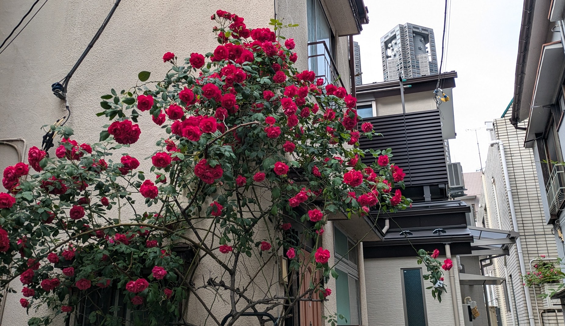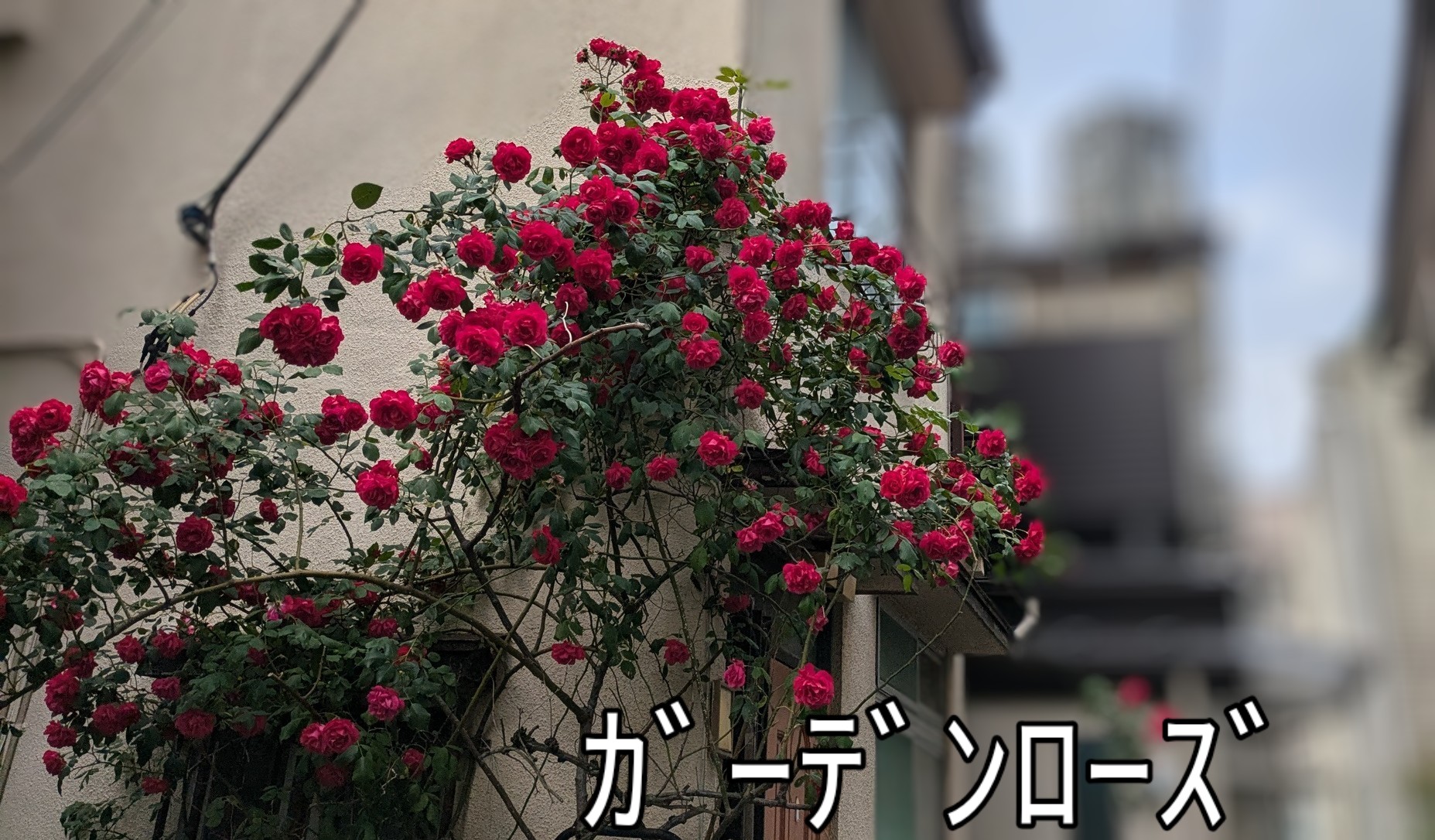 真っ赤な薔薇のガーデンローズと背景に東京都庁舎を入れ撮影しました