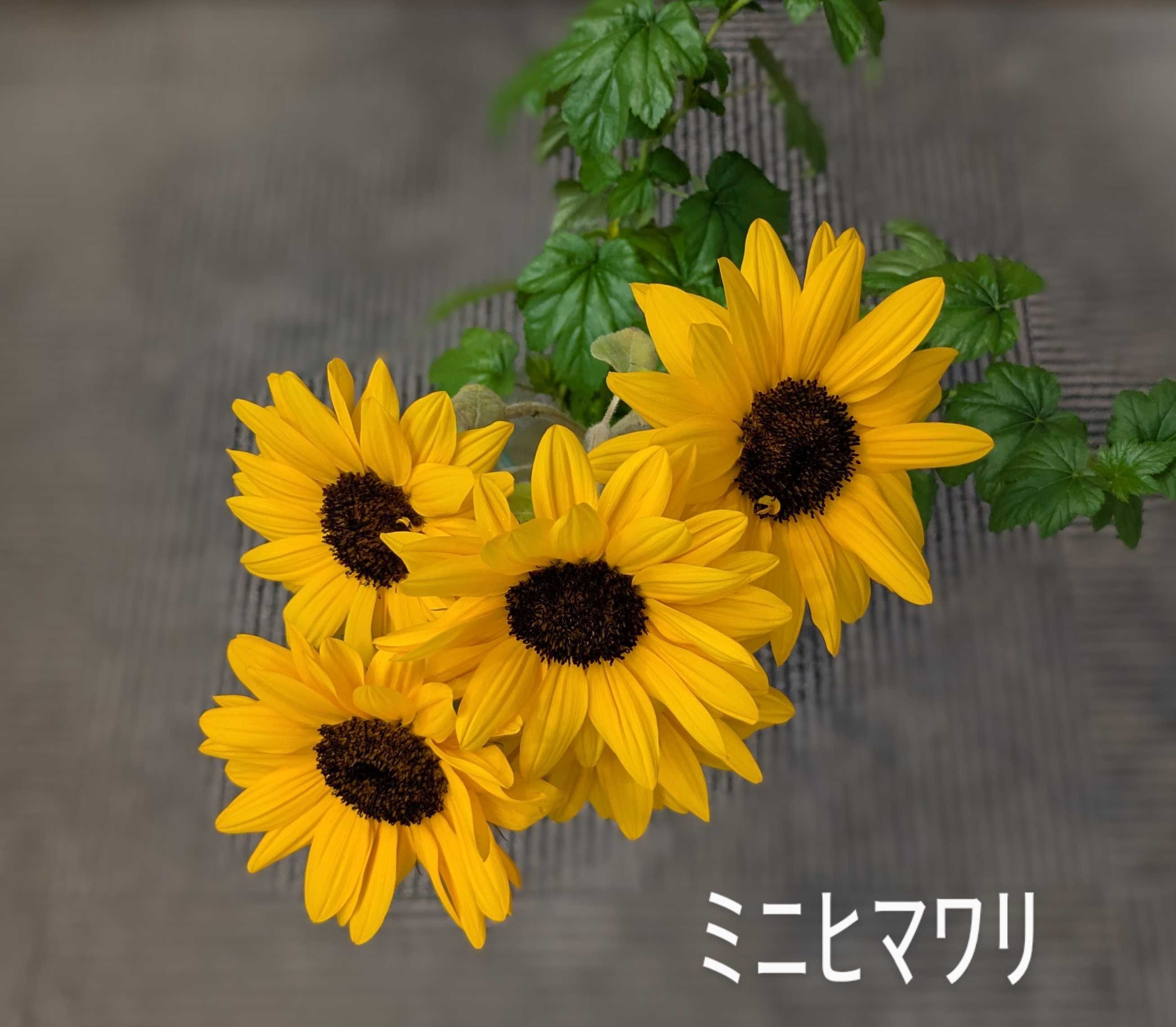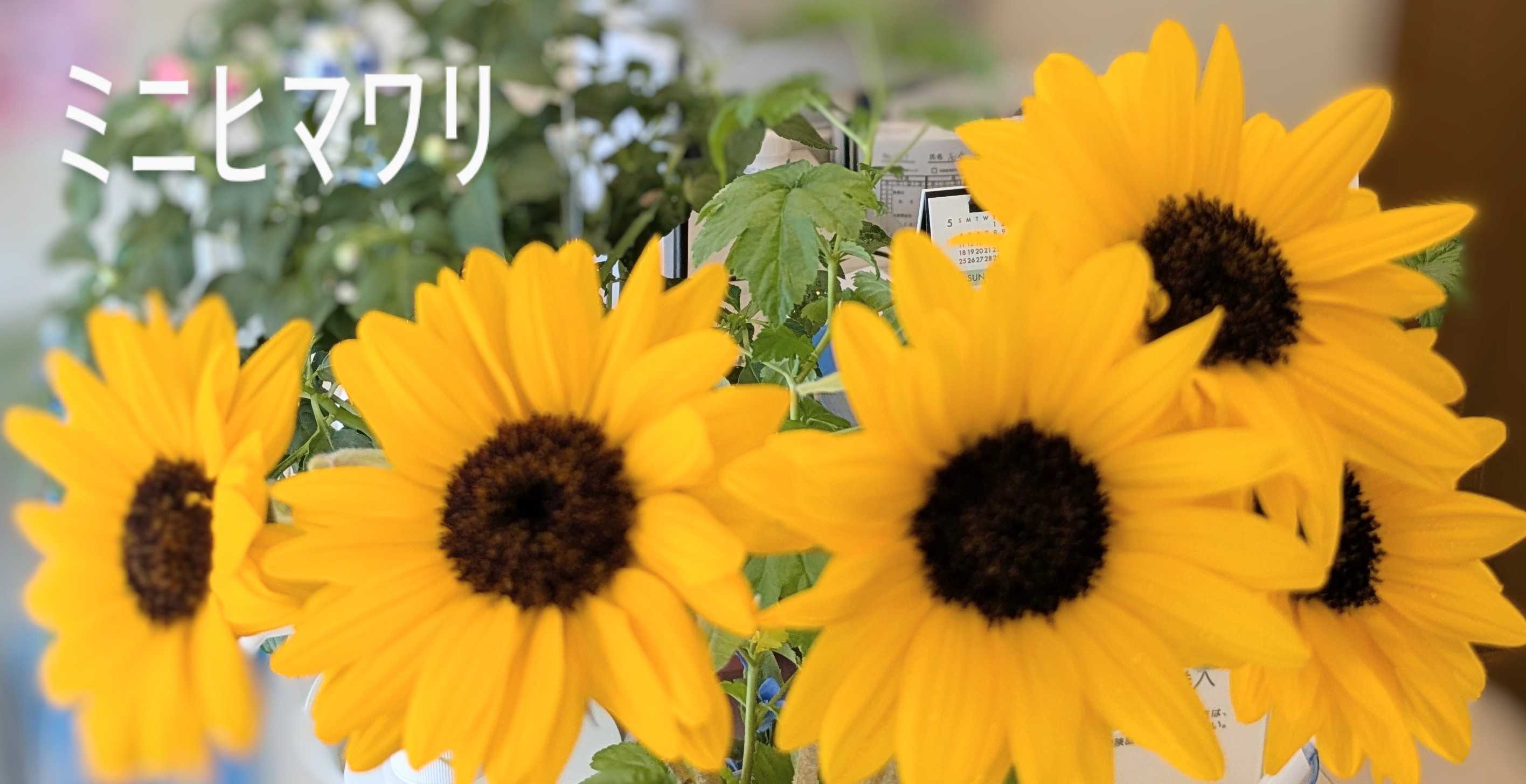 マッサージ屋さんのカウンターに飾られたミニヒマワリを撮影しました