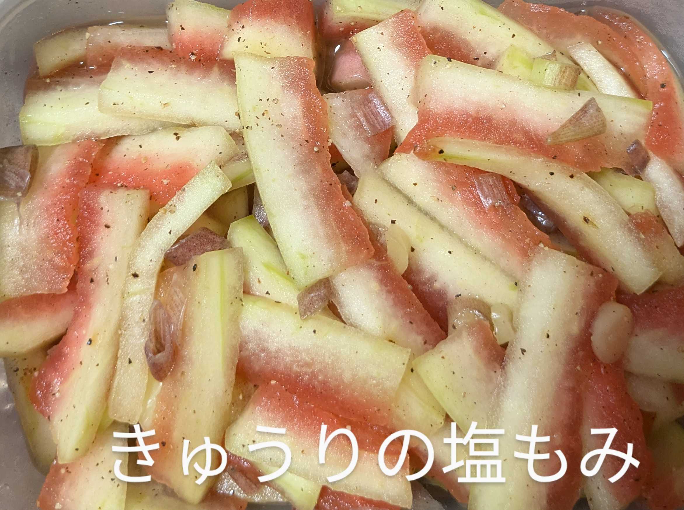 スイカを食べたので スイカの白身と茗荷の茎を塩もみしましたほんだし・バリ島の塩・ブラックペッパーを入れもみました