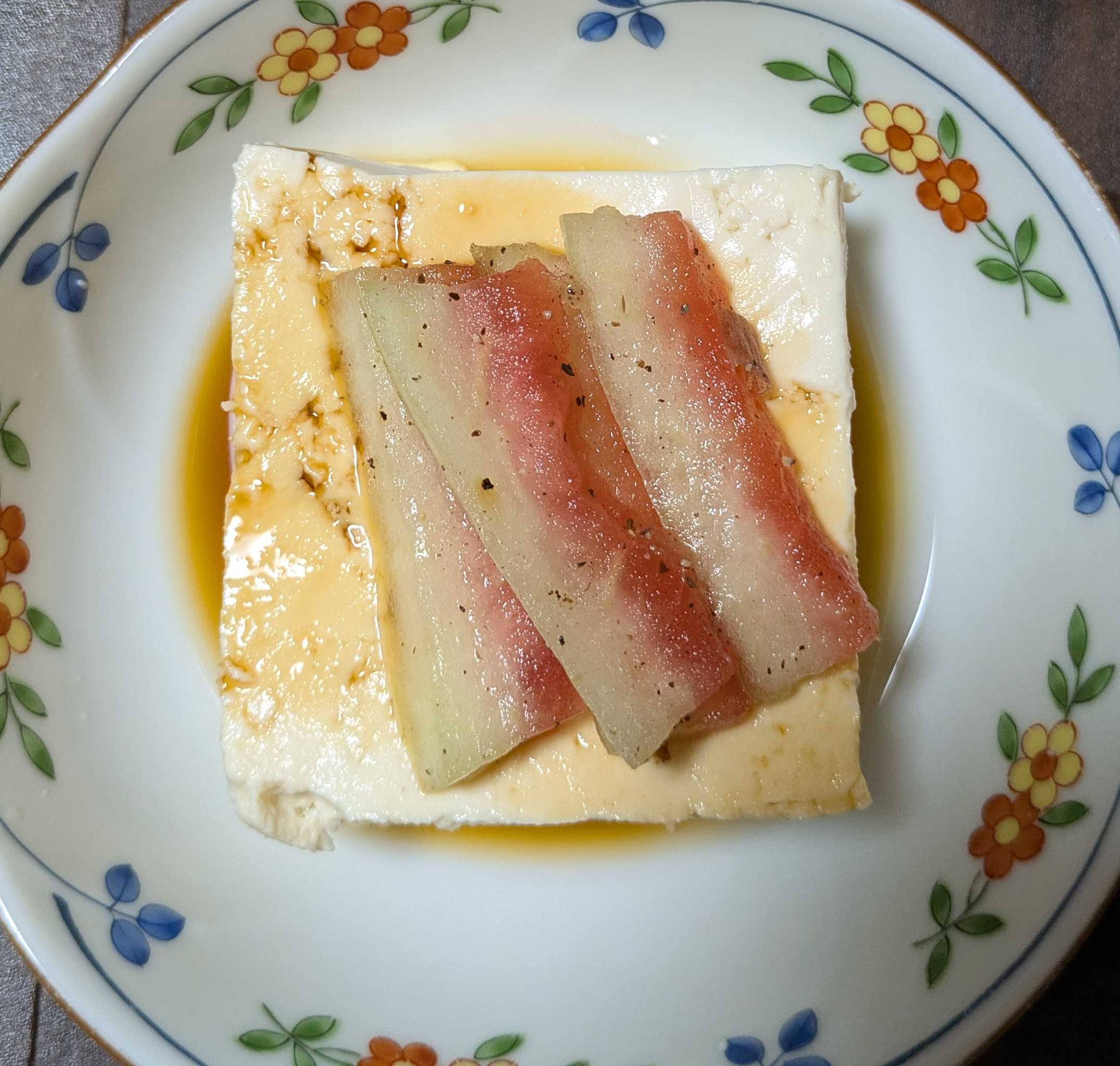 もめん豆腐の上にスイカの白身の塩もみをトッピングしました