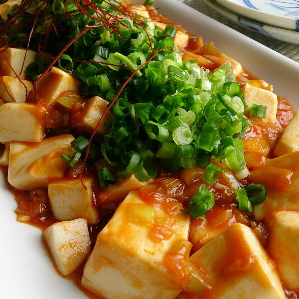 先程の豆腐をよくお湯切りして直ぐに3にいれ、くずさないように炒めます。豆腐をお湯切りしたまま放置するとくっついてえらいことになります。