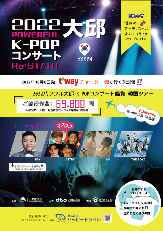商品は大邱と浦項でK-ポップ、K-ドラマなど韓流コンテンツを2泊3日間楽しめるバンドル商品で構成された。 観光客は8日、浦項でドラマ「椿の花のころ」撮影地とホミ岬を訪問し、大邱に移動し、9日夕方、ザ・ボーイズ、アストロなど人気韓流アイドルが出演する「2022パワフル大邱K-POPコンサート」を観覧する予定だ。コンサート観覧前には大邱グルメツアーなどテーマ別コースを好みに合わせて選んで振り返ることができる。