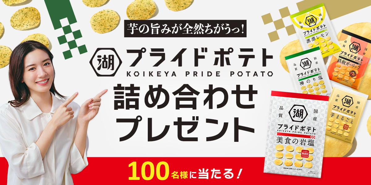 芋の旨みが全然ちがうっ!湖池屋プライドポテト詰め合わせBOXプレゼントキャンペーン湖池屋のメールマガジン「コイケなおやつ部」会員限定キャンペーン、「芋の旨みが全然ちがうっ!湖池屋プライドポテト詰め合わせBOXプレゼントキャンペーン」koikeya.co.jp