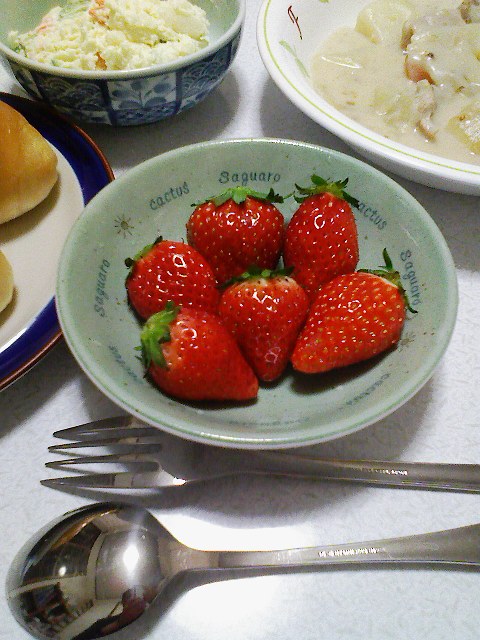 明日は、いちごの日なので、デザートは、いちご!まぁ、いちごの日がいつなのかは、諸説あるけど…。そういえば、石川仲間の いちごさん、しばらく見かけないけど元気にしてるかな??毎回、みわだいさんが探してますよ~。