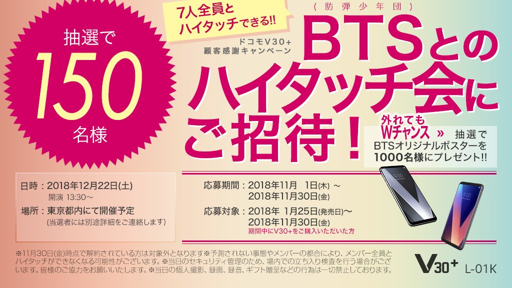 BTS☆「 ドコモ」 ハイタッチ会追記 181101 NTTドコモから発売中の「V30+ L-01K」をご購入いただいた方から抽選で150名様を #BTS とのハイタッチ会にご招待!既に製品をお持ちの方はもちろん、これからご購入いただく方も対象です。応募締め切りは11月末まで! 詳しくは ココ で発見! なんですか!? バンタンとハイタッチ会 まぁ~購入しないんで… 12月22日にまた日本に来てるってことがうれしい~ 前日あたり「Mステ スーパーライブ」ぽい。 また出てくれたらうれしいな