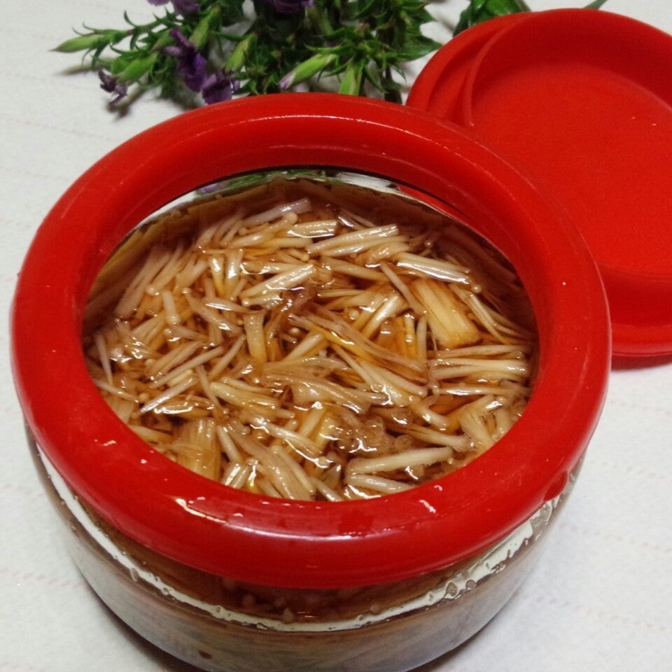 ①スープ用に取り分けた残りのえのき茸約150gに、砂糖(我が家は、てんさい糖)大さじ2と醤油大さじ2を混ぜて、電子レンジで2分ほど加熱したら、できあがり~♪